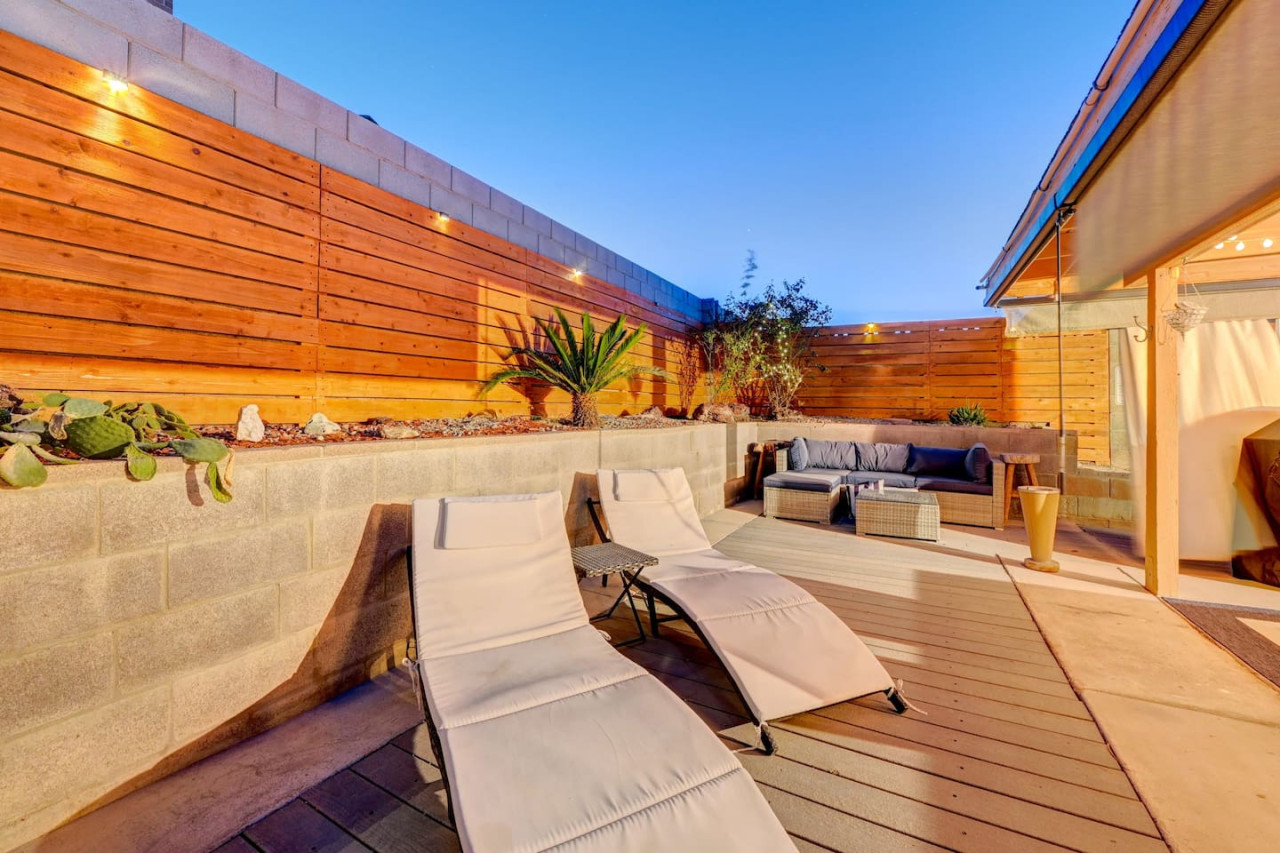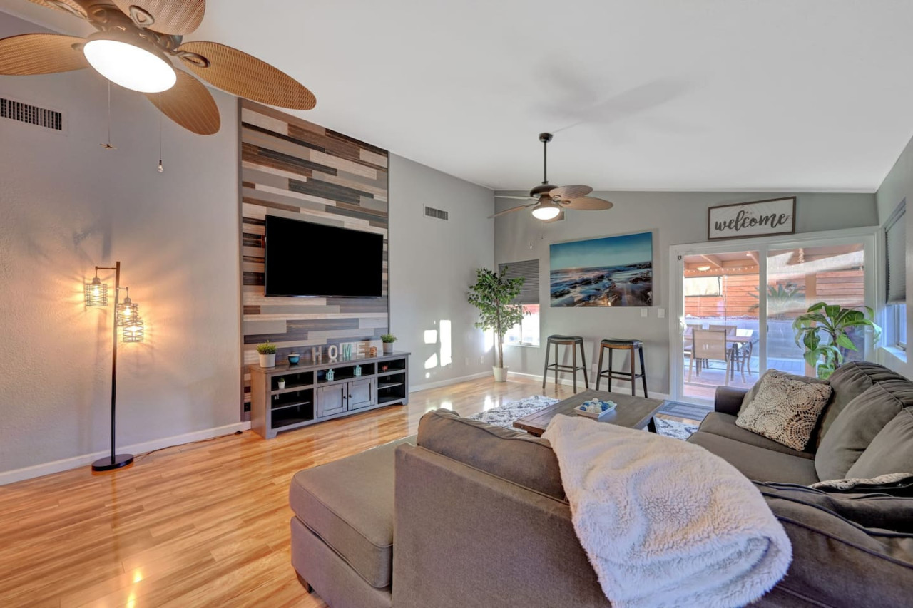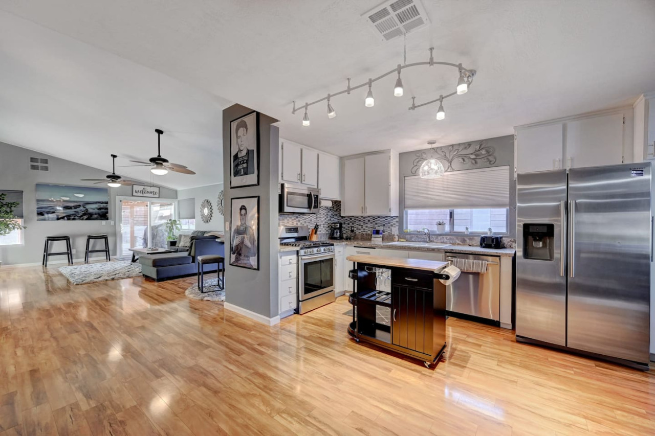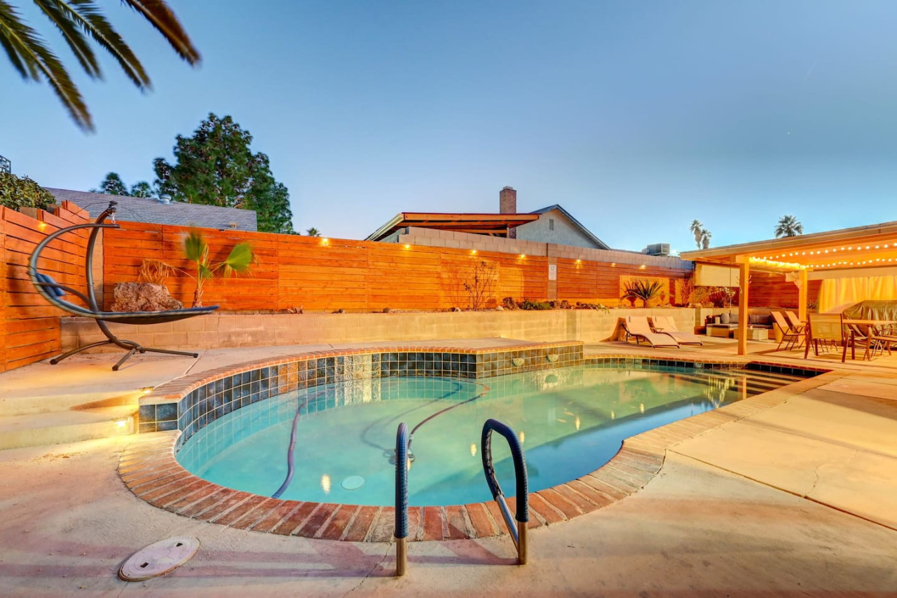 / night☞ 4 private bedrooms ☞ 4 Private Beds ☞ Refreshing private swimming pool with heating available ☞ Full Kitchen ☞ King size bed in primary suite with private bathroom ☞ Single Story Home (no Stairs) ☞ Washer and Dryer ☞ Dishwasher ☞ 8 minutes to the airport ☞ 15 minutes to the Las Vegas Strip and Convention Center. ☞ Blazing fast high-speed internet ☞ Roku, and Smart TVs in every bedroom, living room, and dining room. ☞ Pool heating available at $60 per night Fresh & Fun Four-Bedroom Home – Perfect for Your Vegas Getaway! Just 12 minutes from the iconic Las Vegas Strip, this spacious home is the right place for groups or families. With comfortable bedrooms and room for more on the cozy sectional, this property comfortably sleeps 8. Whether you're here for famous nightlife or a relaxing retreat, you’ll enjoy a perfect vacation in this stunning home. Property Highlights: Private backyard with a beautiful pool and covered patio, ideal for outdoor dining and outdoor activities. The heated pool offers a relaxing escape, and the large backyard provides ample space to unwind. Stunning views and a peaceful atmosphere, perfect for quiet time. Enjoy new furnishings, a spacious kitchen with stainless steel appliances, and a large island for cooking and dining together. The fully stocked kitchen includes essential toiletries, and fresh towels and fresh linens are provided. The primary bedroom is a true retreat, with a stylish bedroom and electric fireplace for added comfort. The home also features 6 flat-screen TVs, fast Wi-Fi, and major streaming services, so you can enjoy your favorite shows during downtime. The property is clean, newly painted, and in good condition. It also offers a smart lock for easy check-in and free parking. Quiet neighborhood with quiet hours to ensure a peaceful environment. This safe community is located in a friendly neighborhood, perfect for relaxation and family fun. Convenient access to major highways, making it easy to explore popular places, including local golf courses for some glorious golfing, famous Las Vegas attractions, and many attractions around the Strip. Only a short drive to the High Roller in the strip, local stores, and great restaurants. Enjoy outdoor living with outdoor space to host BBQs or simply enjoy the fresh air. Just 25-30 minutes to Red Rock, a great spot for hiking and outdoor activities. Additional Features: Entire home offers exclusive use of the property for your group or family. Comfortable stay with spacious living, stylish bedrooms, and natural light throughout the house. High speed Wi-Fi for easy browsing and streaming. Public transportation nearby, making it easy to get around and explore the area. Quiet community with easy access to everything you need for a fun and relaxing stay. Whether you're seeking outdoor activities, stunning bedroom retreats, or a great place to unwind after enjoying the famous Las Vegas nightlife, this property offers the perfect place for a comfortable stay. Book your stay today and experience the best of both relaxation and excitement in this beautiful property! ******************** ✍ Washer and dryer is in the garage. We have smart locks and door codes will be provided to guest for access. ✍ Guests are required to sign a Rental Agreement upon booking. Pool heating is available for $60 per night (minimum of $180 per stay to cover the gas cost). Can be decided 7 days before arrival ✍ We have security cameras facing the street and in the front door. ✍ We have noise monitoring device in the backyard and in the living room. These devices only records the decibels to monitor noise level during quiet hours but NO audio recording. ✍ The fridge is not connected to a waterline due to leak risks. ✍ Security cameras solely facing the street (as required by the City)