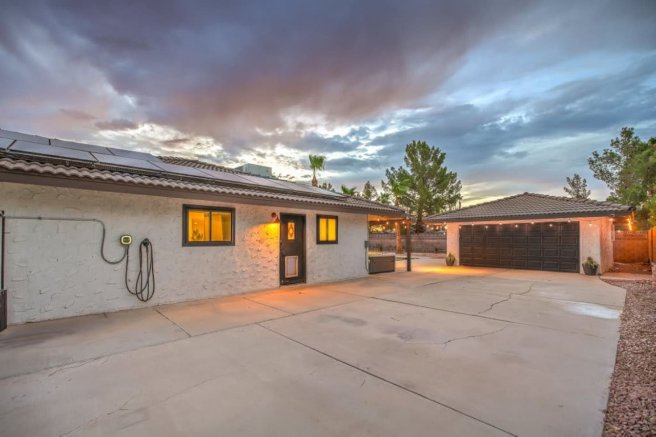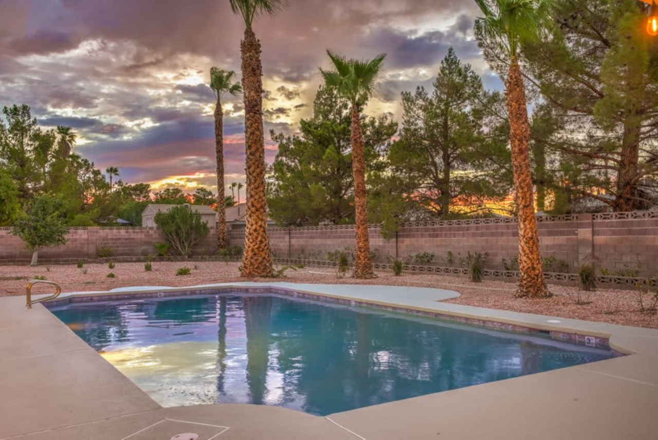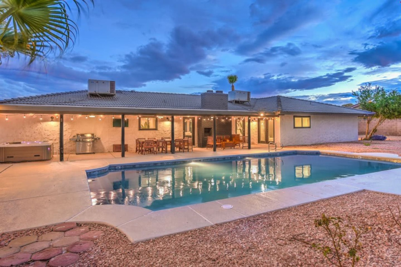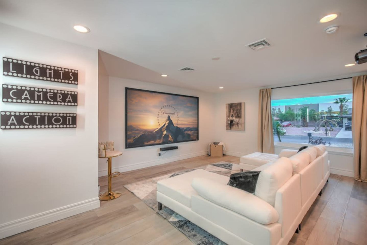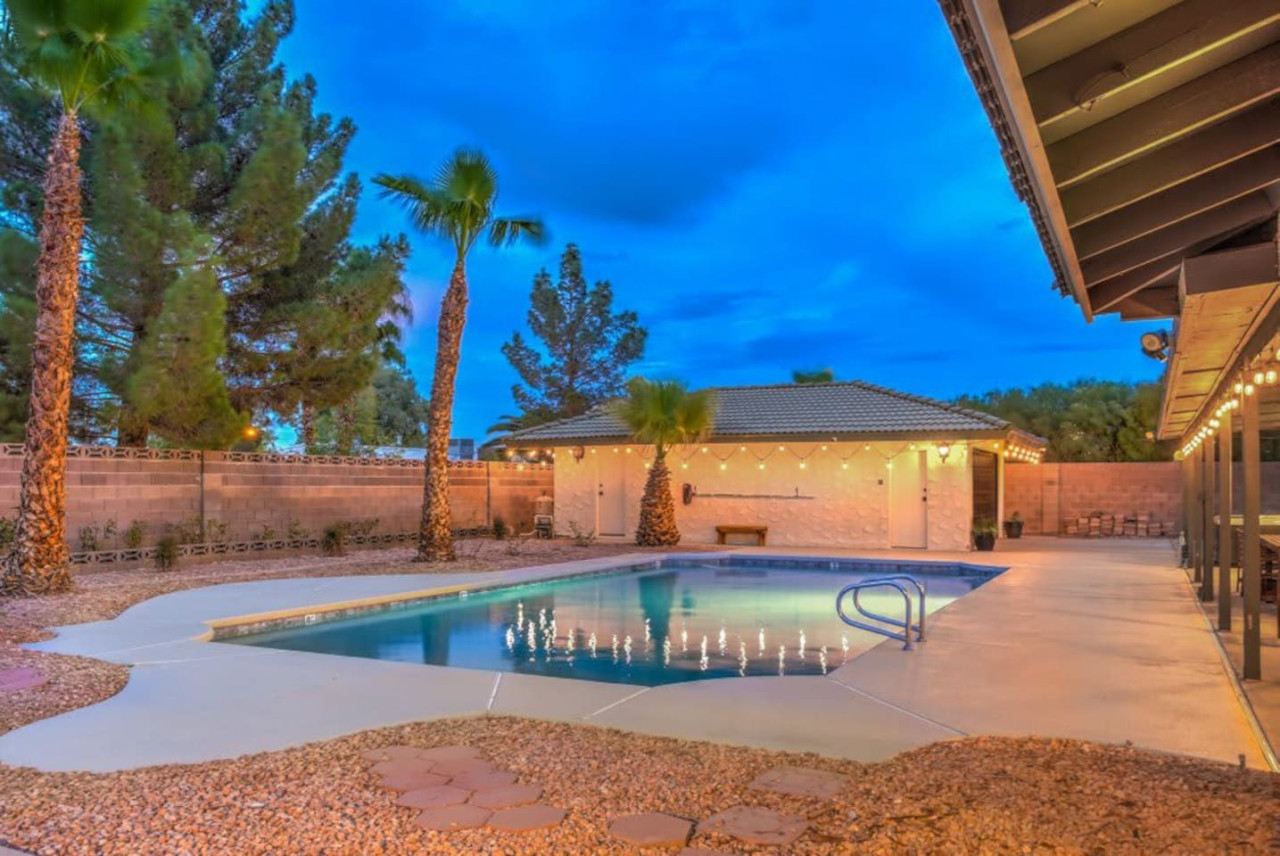 / night☞ 4,016 sq feet | 373.1 sq meters ☞ Single story / one level ☞ 5 individual bedrooms ☞ 4 bathrooms inside, 1 outdoor full bathroom ☞ Private sauna ☞ Private modern swimming pool ☞ Year-around above ground jacuzzi/hot tub ☞ Less than 10 minutes to the Las Vegas Strip and Airport ☞ EV Charging Welcome to our gorgeous modern retreat just minutes from the action in Las Vegas. Situated on a half-acre lot, this stunning residence offers unparalleled style and sophistication. Guests are required to sign a "Guest Rental Agreement" upon booking. * We have security cameras facing the street and in the front door. * We have noise monitoring device in the backyard and in the living room. These devices only records the decibels to monitor noise level during quiet hours but NO audio recording. * Most gas fireplaces are for decorative purposes only. * The fridge is not connected to a waterline due to leak risks. If you need an ice tray and we'll have one delivered within 24 hours All of them are on 24/7 and for security purposes. There is no camera in private area or anywhere inside the house. Security cameras solely facing the street (as required by the City)