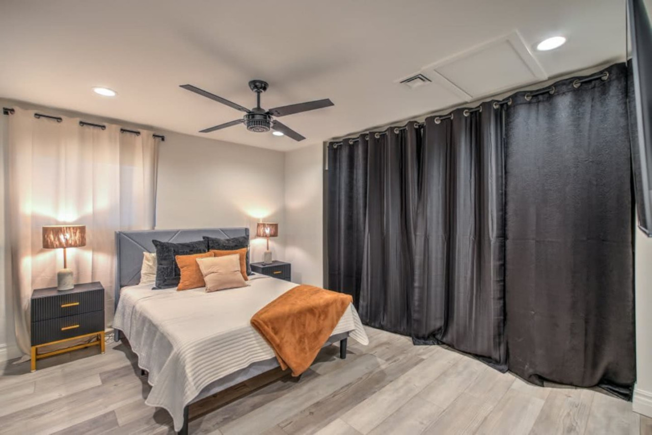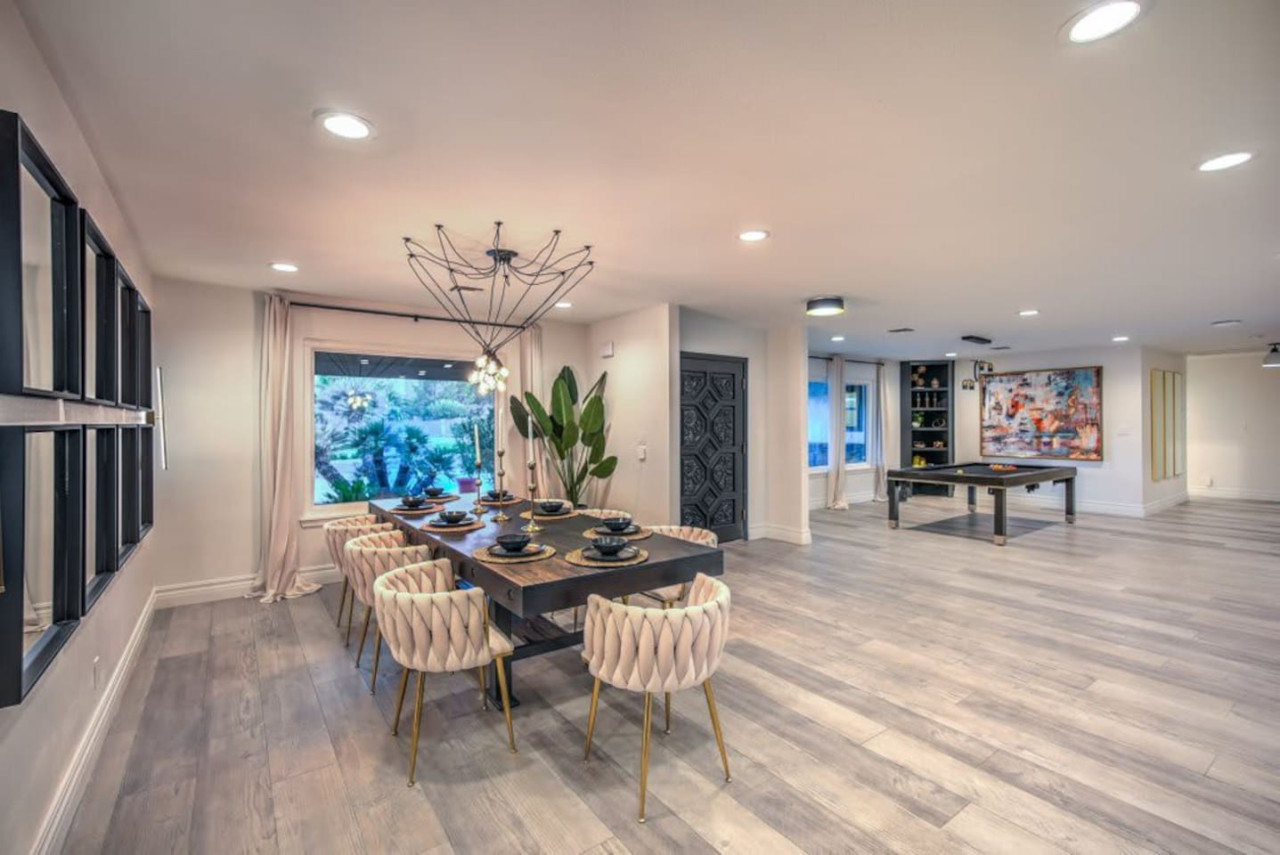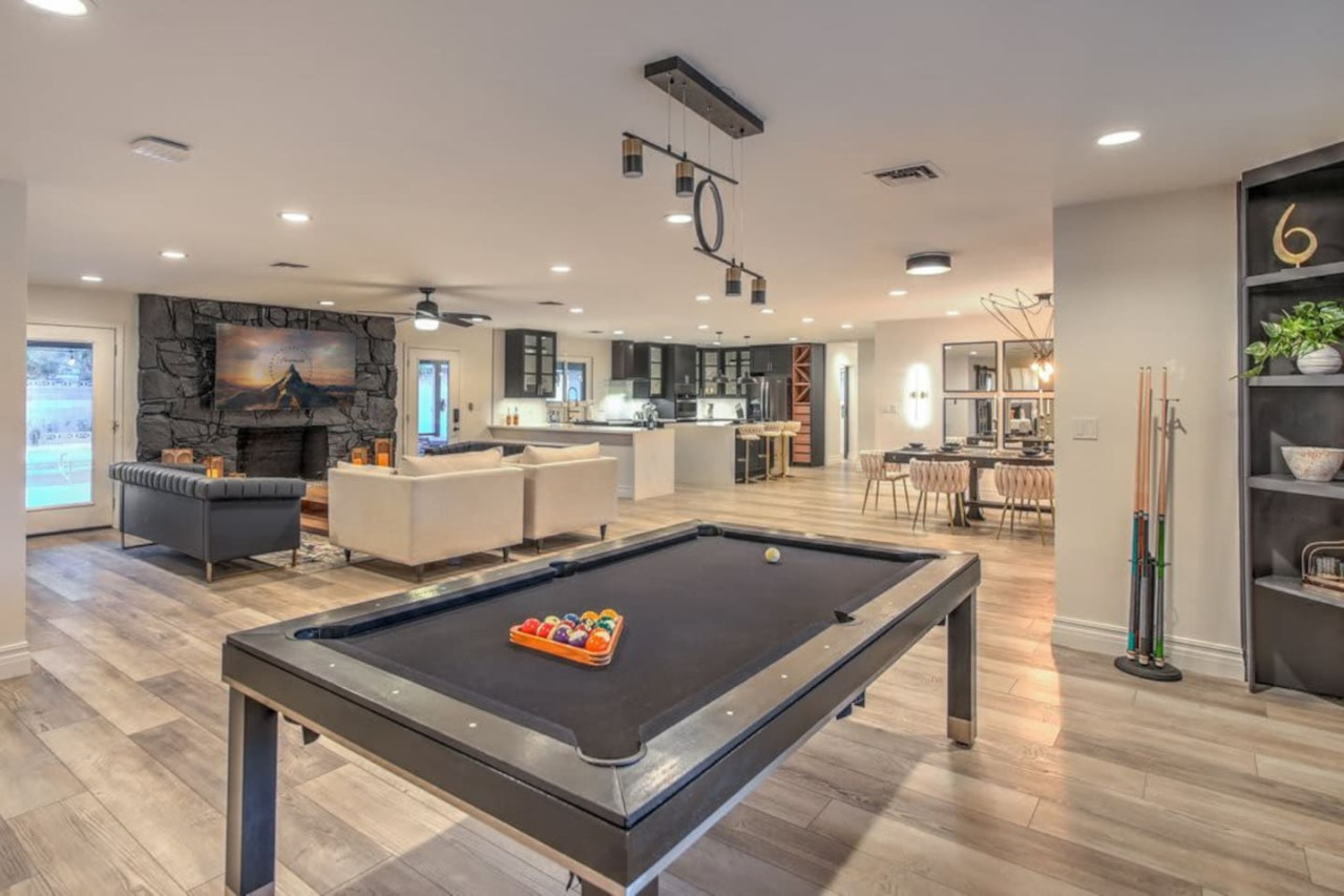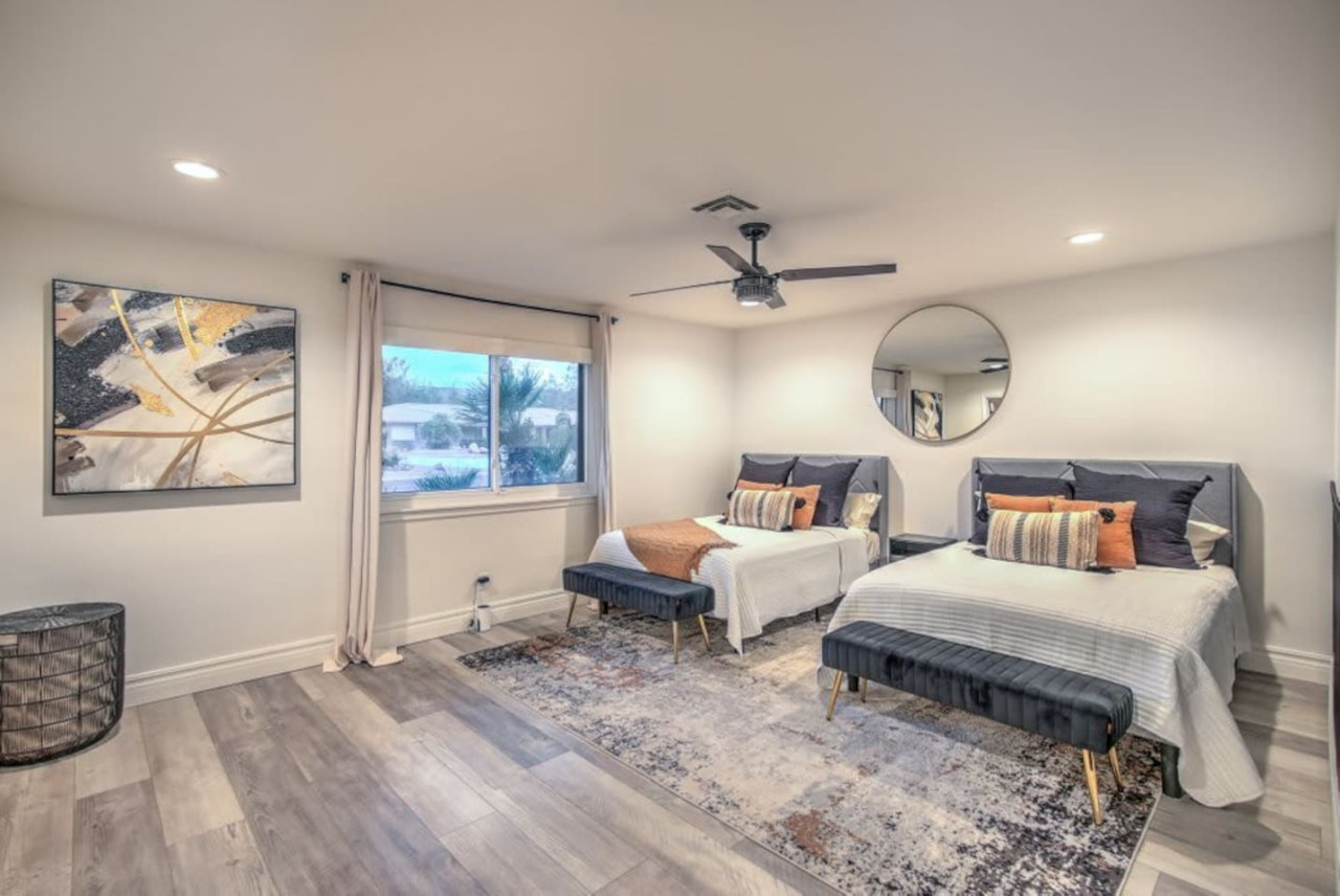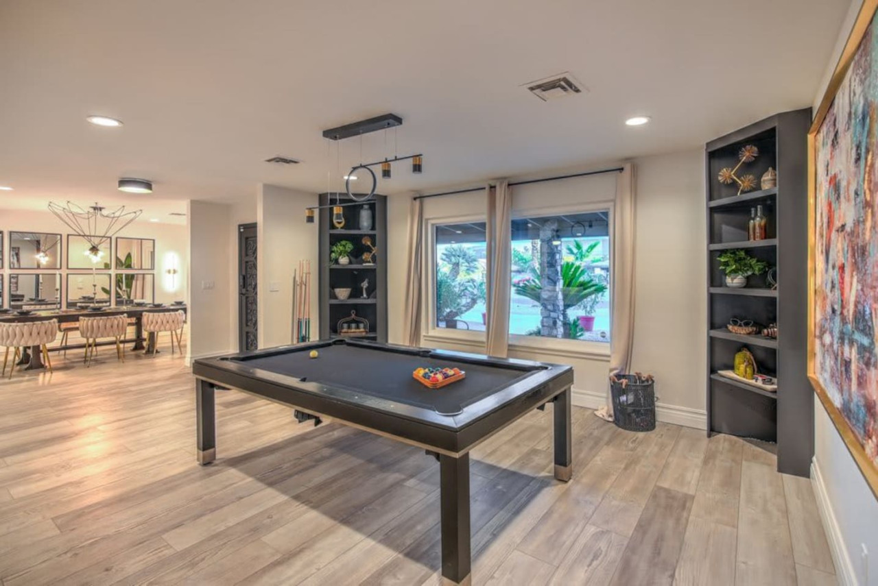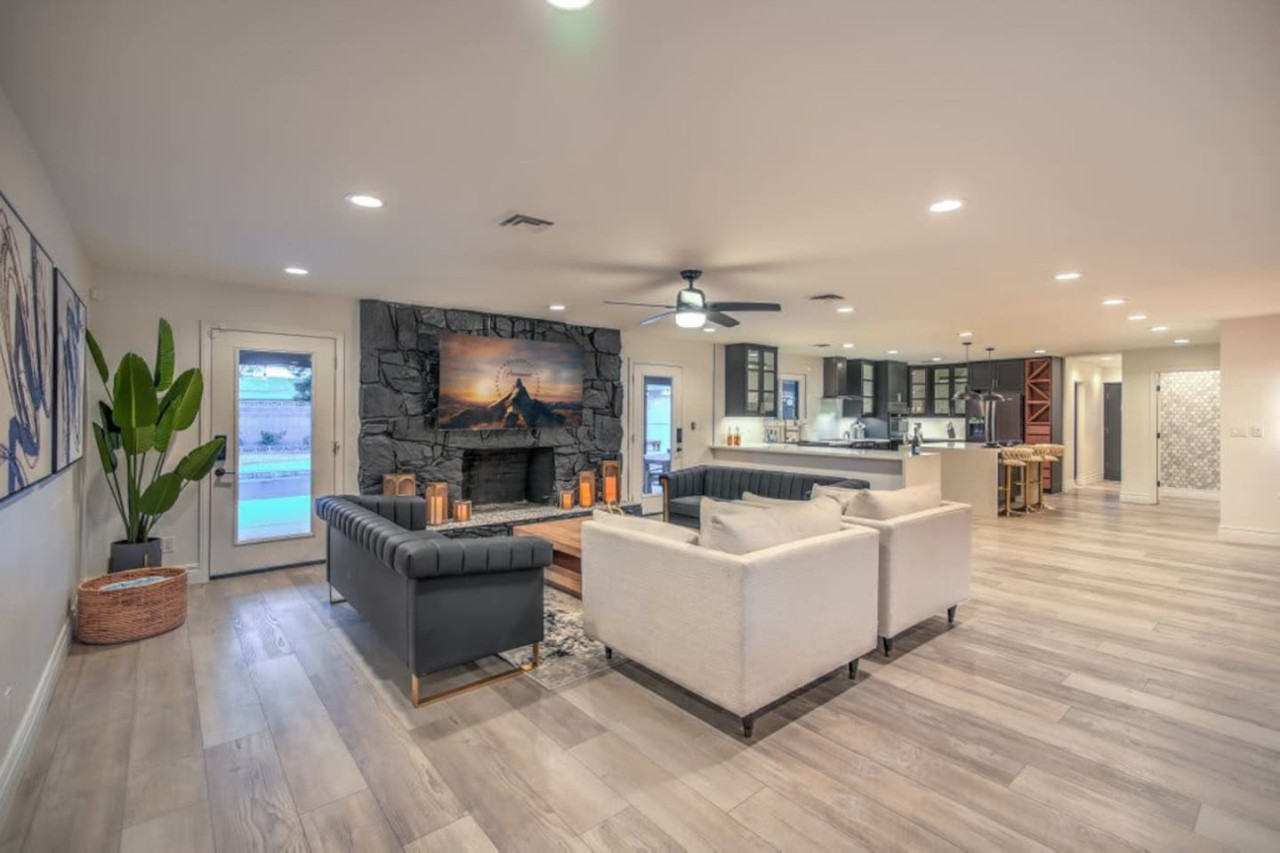 / night☞ 4,016 sq feet | 373.1 sq meters ☞ Single story / one level ☞ 5 individual bedrooms ☞ 4 bathrooms inside, 1 outdoor full bathroom ☞ Private sauna ☞ Private modern swimming pool ☞ Year-around above ground jacuzzi/hot tub ☞ Less than 10 minutes to the Las Vegas Strip and Airport ☞ EV Charging Welcome to our gorgeous modern retreat just minutes from the action in Las Vegas. Situated on a half-acre lot, this stunning residence offers unparalleled style and sophistication. Guests are required to sign a "Guest Rental Agreement" upon booking. * We have security cameras facing the street and in the front door. * We have noise monitoring device in the backyard and in the living room. These devices only records the decibels to monitor noise level during quiet hours but NO audio recording. * Most gas fireplaces are for decorative purposes only. * The fridge is not connected to a waterline due to leak risks. If you need an ice tray and we'll have one delivered within 24 hours All of them are on 24/7 and for security purposes. There is no camera in private area or anywhere inside the house. Security cameras solely facing the street (as required by the City)