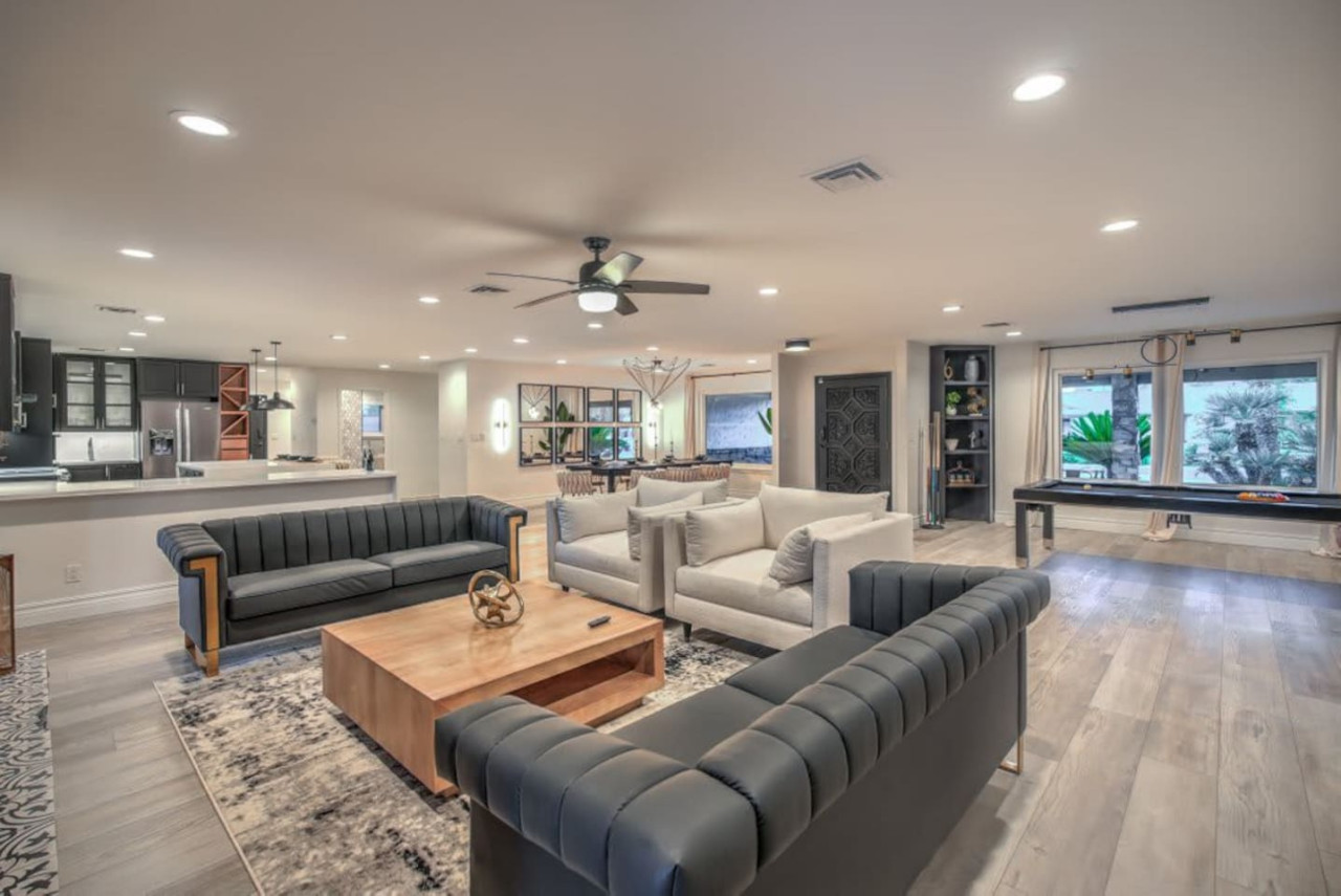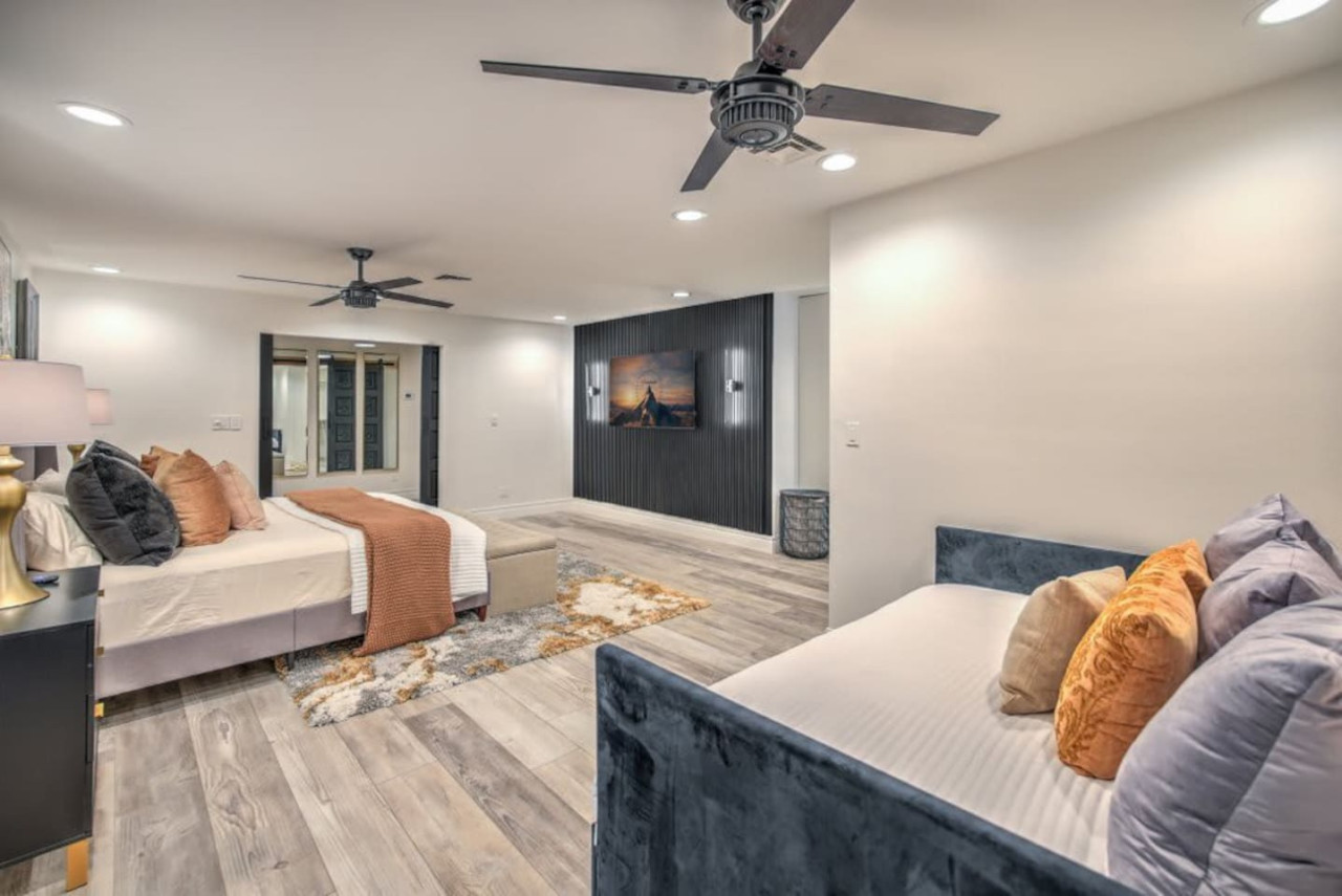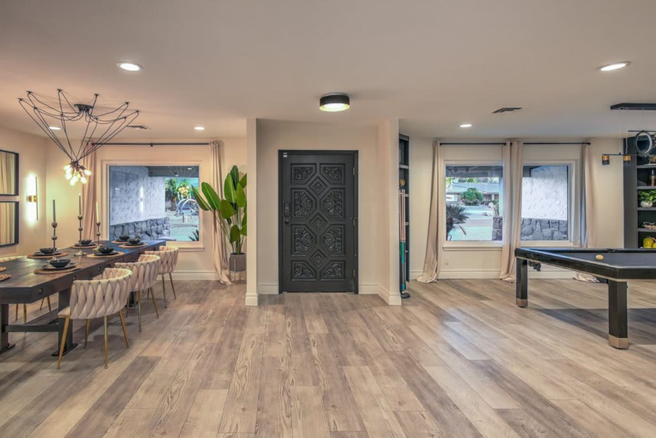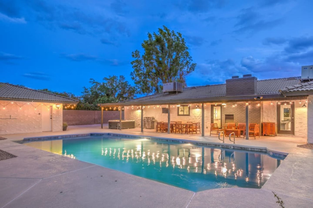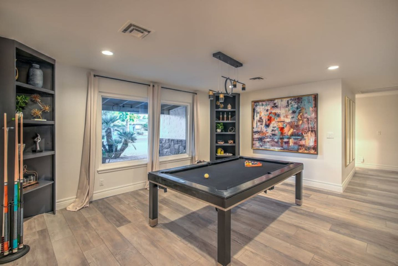 / night☞ 4,016 sq feet | 373.1 sq meters ☞ Single story / one level ☞ 5 individual bedrooms ☞ 4 bathrooms inside, 1 outdoor full bathroom ☞ Private sauna ☞ Private modern swimming pool ☞ Year-around above ground jacuzzi/hot tub ☞ Less than 10 minutes to the Las Vegas Strip and Airport ☞ EV Charging Welcome to our gorgeous modern retreat just minutes from the action in Las Vegas. Situated on a half-acre lot, this stunning residence offers unparalleled style and sophistication. Guests are required to sign a "Guest Rental Agreement" upon booking. * We have security cameras facing the street and in the front door. * We have noise monitoring device in the backyard and in the living room. These devices only records the decibels to monitor noise level during quiet hours but NO audio recording. * Most gas fireplaces are for decorative purposes only. * The fridge is not connected to a waterline due to leak risks. If you need an ice tray and we'll have one delivered within 24 hours All of them are on 24/7 and for security purposes. There is no camera in private area or anywhere inside the house. Security cameras solely facing the street (as required by the City)
