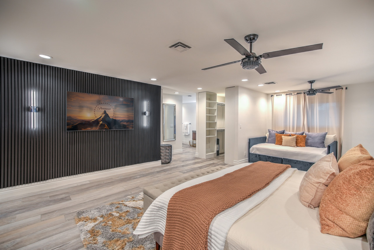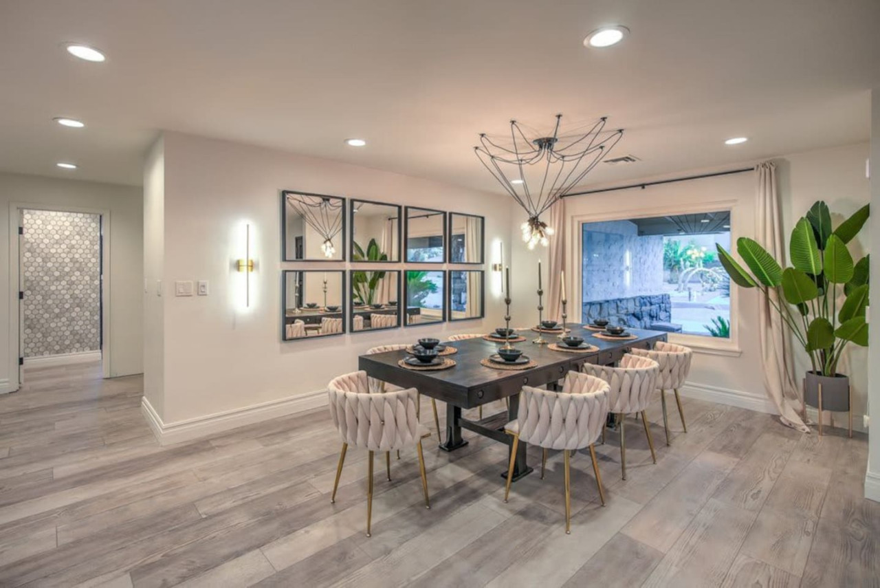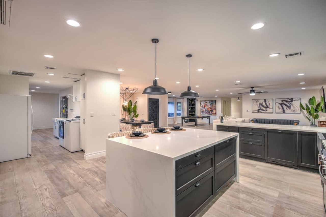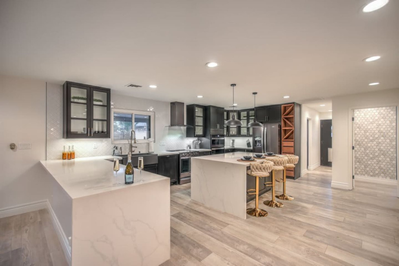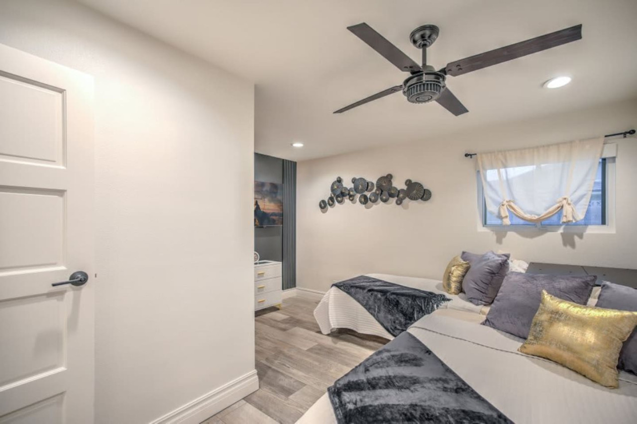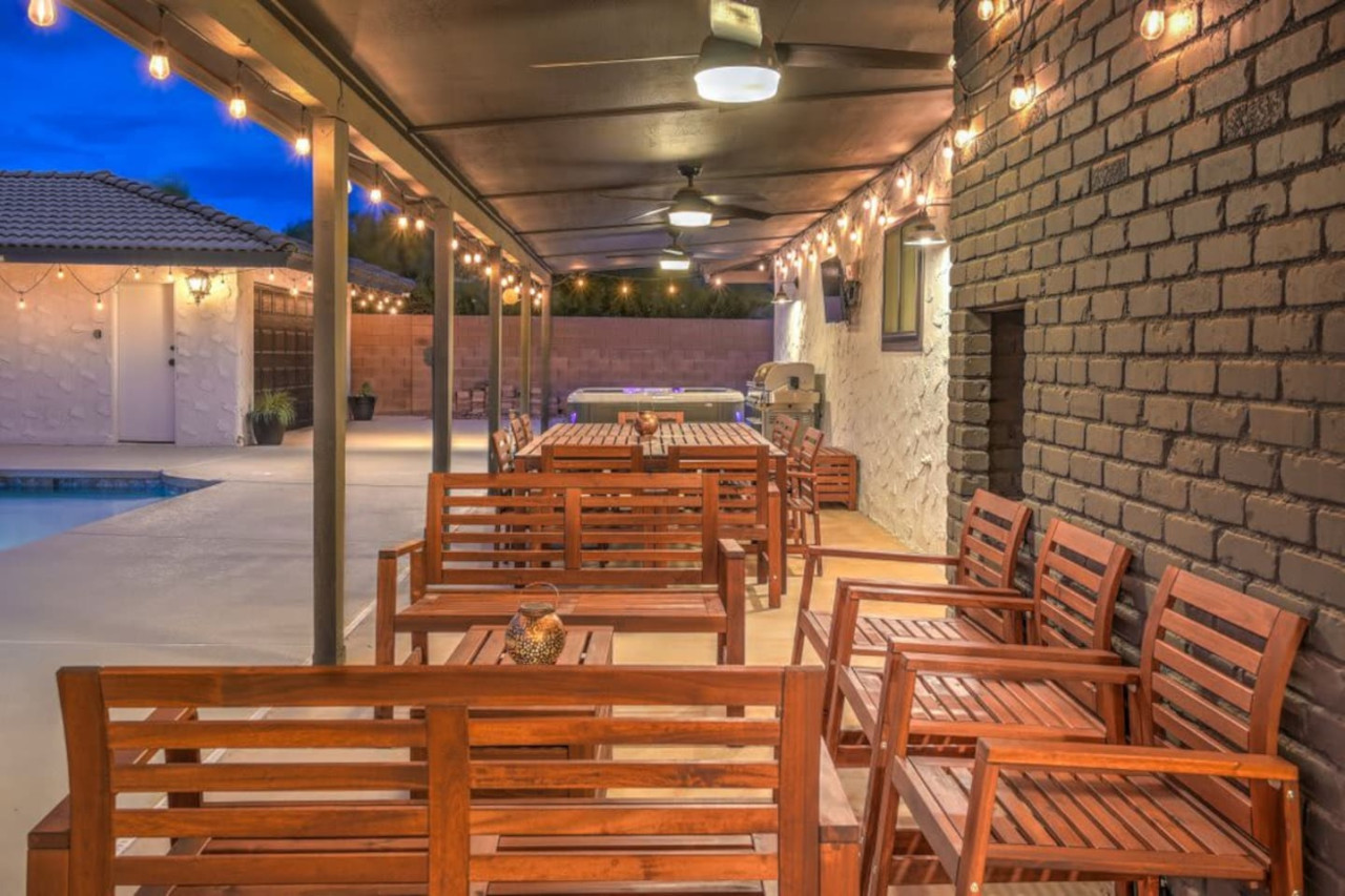 / night☞ 4,016 sq feet | 373.1 sq meters ☞ Single story / one level ☞ 5 individual bedrooms ☞ 4 bathrooms inside, 1 outdoor full bathroom ☞ Private sauna ☞ Private modern swimming pool ☞ Year-around above ground jacuzzi/hot tub ☞ Less than 10 minutes to the Las Vegas Strip and Airport ☞ EV Charging Welcome to our gorgeous modern retreat just minutes from the action in Las Vegas. Situated on a half-acre lot, this stunning residence offers unparalleled style and sophistication. Guests are required to sign a "Guest Rental Agreement" upon booking. * We have security cameras facing the street and in the front door. * We have noise monitoring device in the backyard and in the living room. These devices only records the decibels to monitor noise level during quiet hours but NO audio recording. * Most gas fireplaces are for decorative purposes only. * The fridge is not connected to a waterline due to leak risks. If you need an ice tray and we'll have one delivered within 24 hours All of them are on 24/7 and for security purposes. There is no camera in private area or anywhere inside the house. Security cameras solely facing the street (as required by the City)