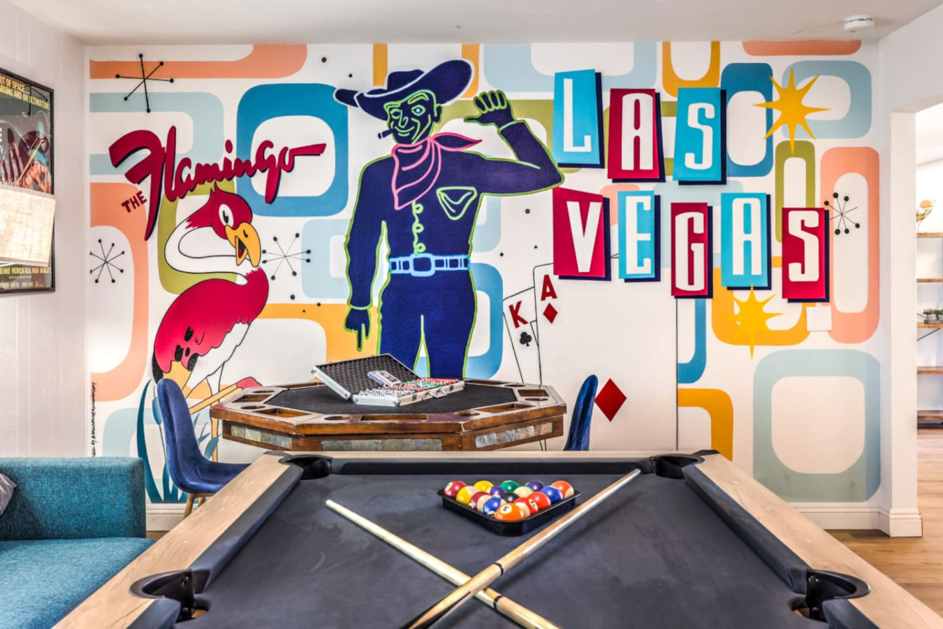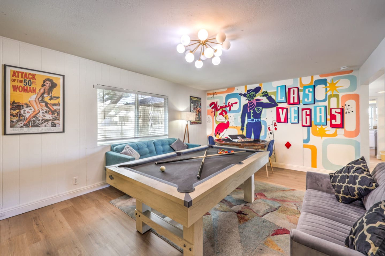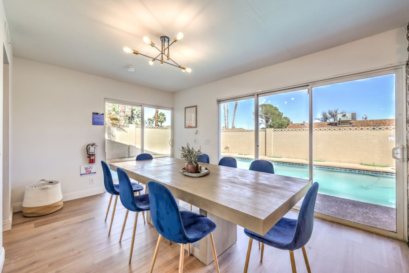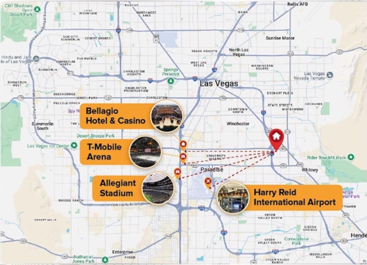 / nightEnjoy a Memorable Stay at Your Desert Oasis Retreat! Enjoy the warm Vegas summers with the expansive private pool! A 6-person jetted hot tub is also available for your enjoyment, and 2 electric bikes are available for rent to explore the beautiful views and local parks. Whether you’re looking to relax or explore, this is the right place for a unique vacation experience. ☞ 2,373 sq ft | 213.7 sq m ☞ 5 private bedrooms with comfortable bedrooms and luxurious bedroom options ☞ 9 beds, including full beds for maximum capacity ☞ Full bedroom and bathroom downstairs for added convenience ☞ Just 15 minutes east of the Las Vegas Strip and airport ☞ Mid-century modern design with central air throughout ☞ Fully equipped kitchen, perfect for preparing delicious meals in the furnished kitchen, and a comfortable entertaining room with a 75" smart TV & poker table! ☞ Clark County STVR License Number: 2006540 The Amenities Include: • Chef’s kitchen equipped with all essential tools, including an electric kettle • Pots, pans, crock pot, roasting pans, and kitchen utensils for your convenience • Full coffee bar to jump-start your day • Huge backyard with an L-shaped private pool and life jackets, towels, and floaties available • Large terrace with plenty of seating, overlooking the pool—perfect for outdoor dining or enjoying a quiet experience • Barbecue grill for outdoor cooking and 3 separate outdoor dining areas, including a sectional seating area on the terrace • 2 large lounge chairs for sunbathing and an epic patio for relaxation • Poker room with poker table and chips, a 75-inch flat-screen TV, and a selection of board games • Major streaming options available on all TVs (Netflix, Hulu, Amazon Prime) • High-speed Wi-Fi and fast Wi-Fi for streaming your favorite shows or working remotely • Dedicated workspace in the Master bedroom, perfect for those working remotely or planning their next adventure • Washer and dryer available in the garage, along with a smart lock for secure and easy access • 2-car garage with a large driveway; RV parking available for larger groups • Keyless entry for seamless check-in Additional Features: • Spacious living areas for relaxation and entertainment • Spacious retreat with full bathrooms and ensuite bathrooms in several bedrooms for added privacy • Quiet neighborhood providing the perfect setting for a restful night’s sleep • Full laundry facilities in the garage and an outdoor family setup with a huge garden • Expansive backyard perfect for family fun or a huge picnic • Quiet community and residential neighborhood, providing the best of both worlds: relaxation and access to nearby attractions • Close to famous nightlife, including the Big Apple Coaster and Hard Rock (just 15 minutes away) • Only 20 minutes to Red Rock Canyon—an ideal spot for your next adventure • Prime location near local stores and local food options • Late checkout when available to ensure you have a relaxed, stress-free departure • Large groups can comfortably stay here with maximum capacity for everyone • Heated pool and hot tub for year-round enjoyment • Full-size and spacious bedrooms, all with fresh linens and comfortable vacation vibes • Full baths, including double vanities and luxurious touches in the bathrooms • Key features like smart TVs in all main rooms for entertainment at any time • Ideal for families or groups seeking a perfect vacation experience • Close proximity to international airport for easy travel ☞ Clark County STVR License Number: 2006540 Whether you’re enjoying an exciting day exploring the famous Vegas sites or unwinding in your own private oasis, this gorgeous home has everything you need for a memorable stay. Book now for a luxurious getaway in one of the best locations near famous nightlife and popular sites! The most exciting neighborhood in the world is just up the street! Also just 6 minutes to Reid International Airport About 10 minutes away from: ☞ Allegiant Stadium, home of the Raiders ☞ T-Mobile Arena, home of the Golden Knights ☞ Bellagio Conservatory ☞ Bellagio Gallery of Fine Art ☞ Fountains of Bellagio ☞ The Art of Richard MacDonald Presented by Cirque du Soleil ☞ CAESARS PALACE ☞ FORUM SHOPS ☞ Adventuredome at Circus Circus ☞ ARIA Campus Fine Art Collection ☞ The Gallery Featuring Dale Chihuly ☞ COSMOPOLITAN - The Ice Rink at Boulevard Pool Open Nov. 20 to Jan. 10 ☞ FLAMINGO - Wildlife Habitat at the Flamingo ☞ LINQ PROMENADE ☞ Brooklyn Bowl Bowling Lanes ☞ High Roller ☞ FlyLINQ ☞ Arcadia Earth ☞ Barbie: The Exhibition ☞ Big Bus Tours ☞ Fashion shows at Fashion Show mall ☞ FlyOver Las Vegas ☞ Hollywood Cars Museum ☞ Las Vegas Explorer Pass ☞ M&M's World ☞ Strip Gun Club ☞ The Range 702 ☞ Vegas Indoor Skydiving ☞ Welcome to Las Vegas sign Easy 10 minute Uber access to the Las Vegas Strip Easy bus rides up Flamingo Road to the Strip Guests are required to sign a "Guest Rental Agreement" upon booking. * We have security cameras facing the street and in the front door. * We have noise monitoring device in the backyard and in the living room. These devices only records the decibels to monitor noise level during quiet hours but NO audio recording. All of them are on 24/7 and for security purposes. There is no camera in private area or anywhere inside the house. Security cameras solely facing the street (as required by the City)