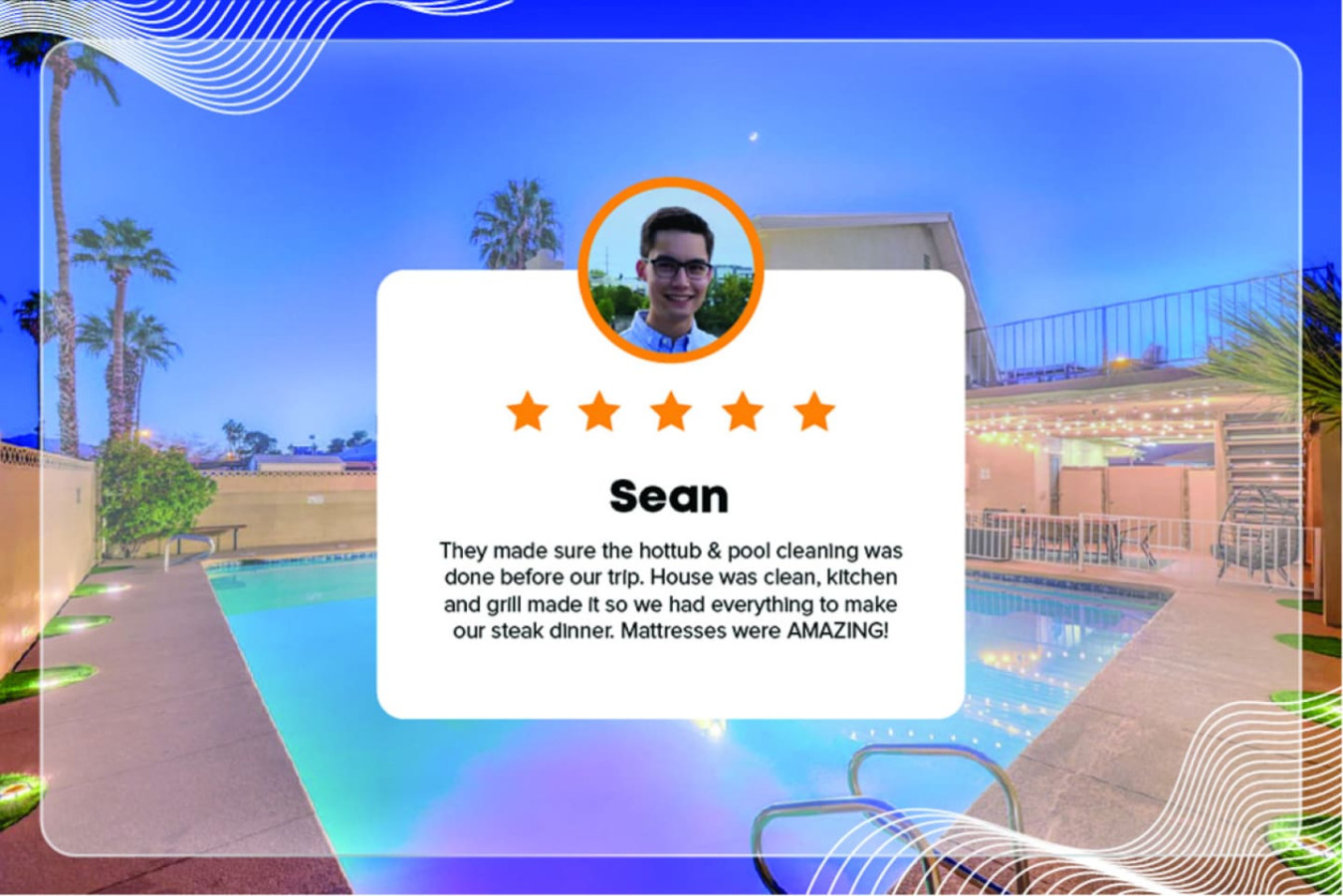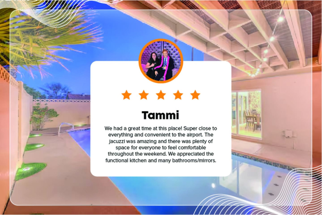 February 2025 5.00We had a great time at this place! Super close to everything and convenient to the airport. The jacuzzi was amazing and there was plenty of space for everyone to feel comfortable throughout the weekend. We appreciated the functional kitchen and many bathrooms/mirrors.