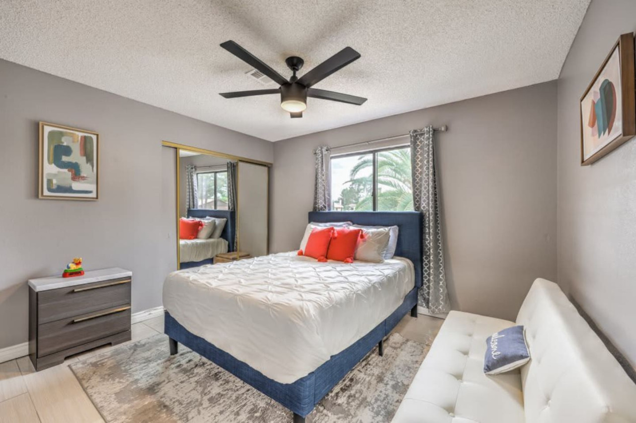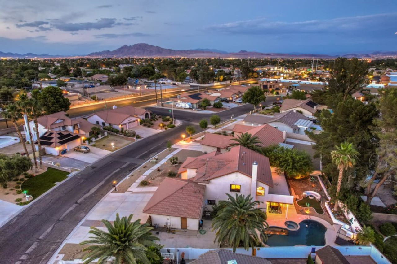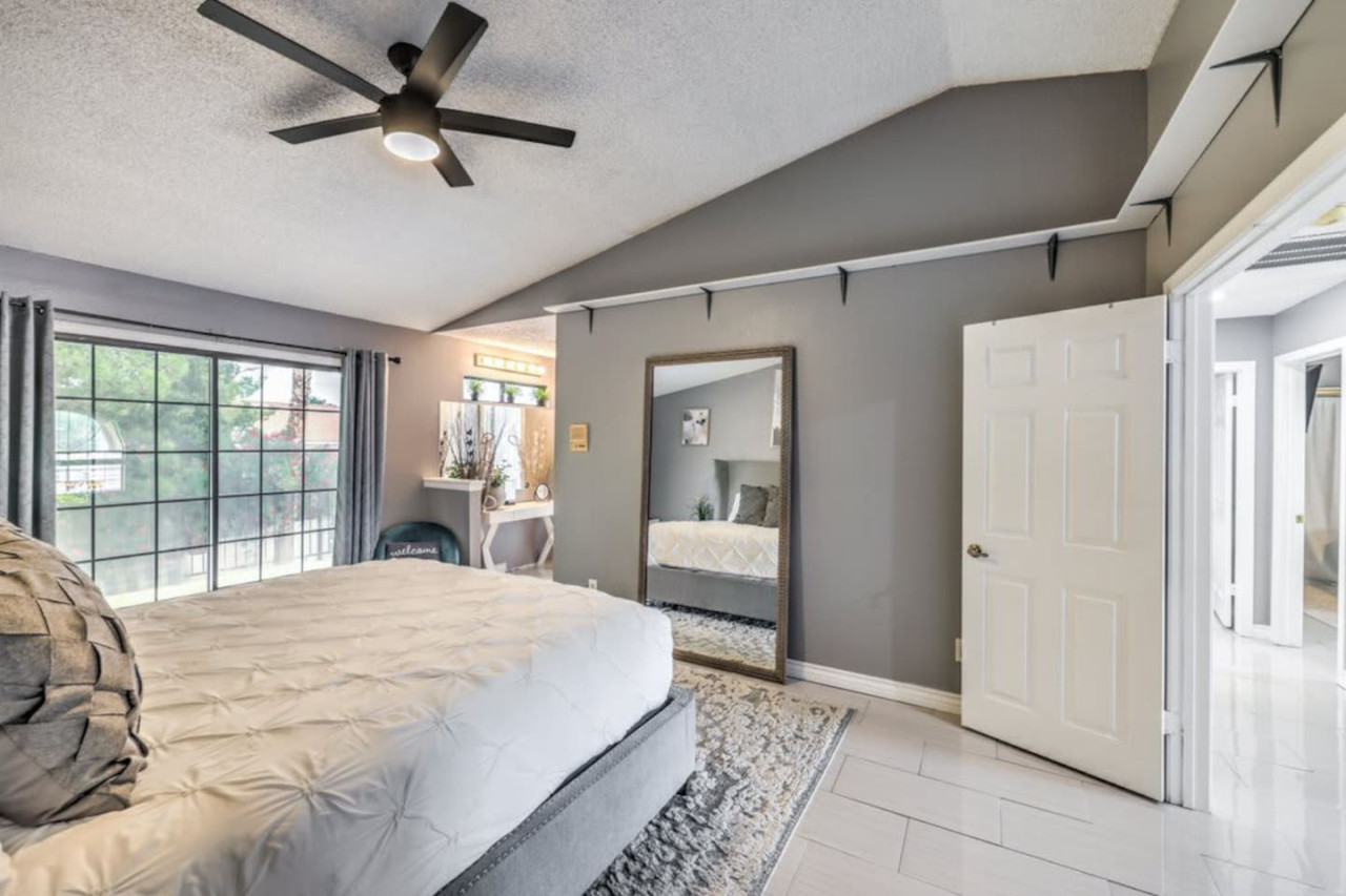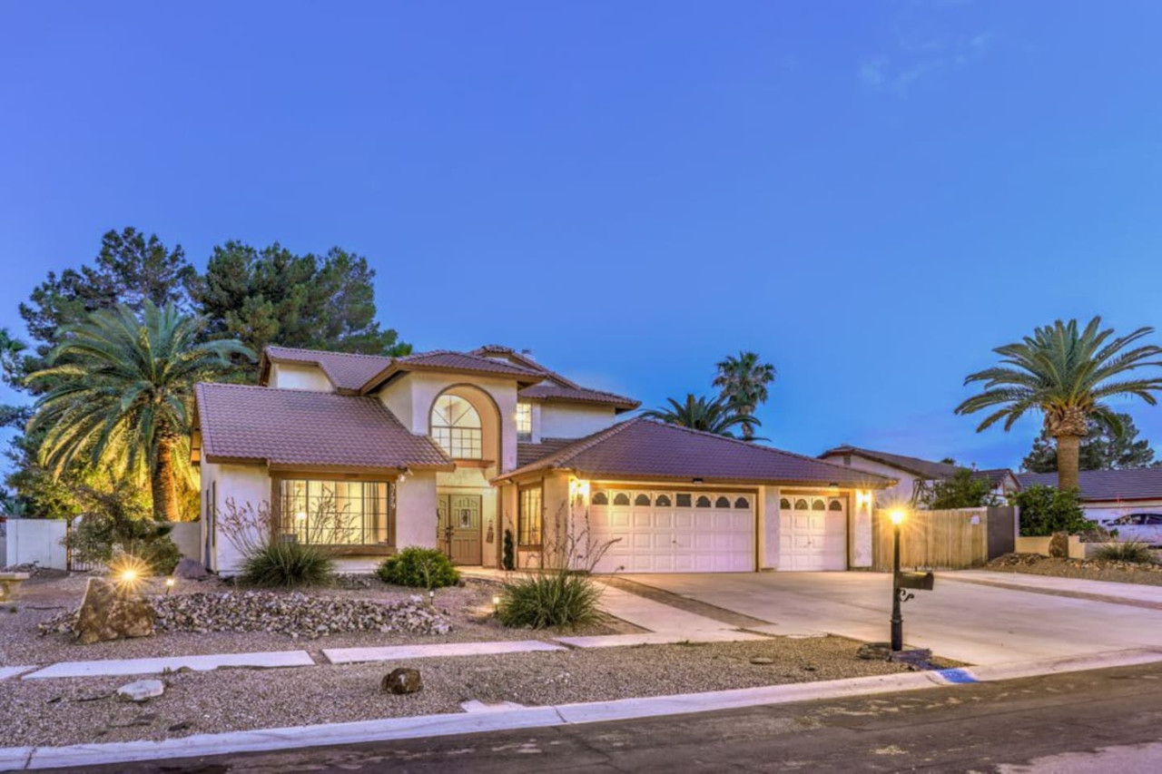 / night☞ 2,295 square feet | 213.21 sq meters ☞ 3 private bedrooms ☞ 2.5 bathrooms ☞ 4 Individual Beds ☞ Only 10 minutes to the Strip/Airport ☞ 2 - car private garage ☞ RV parking! ☞ Sparkling, modern PebbleTec pool and spa. Welcome to your luxurious private retreat in the heart of Las Vegas, where you can enjoy a peaceful and relaxing stay while still being just minutes away from the excitement and entertainment that the city is known for. Our stunning modern home, available for stays of 30 days or more, has been compl As you step inside this beautifully designed home, you'll be greeted by an open-concept living area with stylish furnishings, contemporary décor, and abundant natural light. The spacious living room features comfortable seating, perfect for unwinding after a day of exploring the city, and a large flat-screen TV for your entertainment needs. The fully equipped gourmet kitchen boasts state-of-the-art appliances, sleek countertops, and all the essentials you need to prepare delicious meals during your stay. Enjoy your culinary creations at the elegant dining table, which comfortably seats up to six guests. Our home offers three generously sized bedrooms, each featuring plush beds and high-quality linens to ensure a restful night's sleep. The primary bedroom includes a private en-suite bathroom with a walk-in shower and a soaking tub for ultimate relaxation. Outside, you'll find your own personal oasis with a sparkling PebbleTec pool and spa, surrounded by lush landscaping and ample lounge seating. This outdoor space is perfect for soaking up the sun, taking a refreshing dip, or enjoying a leisurely swim under the stars. In addition to the luxurious amenities within the home, you'll also have access to a two-car garage and dedicated RV parking, providing ample space for your vehicles during your stay. Our home's prime location means you're only a short drive away from Las Vegas' top attractions, including the famous Strip, Allegiant Stadium, and Reid International Airport. Whether you're visiting Las Vegas for business, pleasure, or an extended stay, our modern and sophisticated home offers the perfect blend of comfort, convenience, and luxury. Book your stay today and experience the best that the entertainment capital of the world has to offer, all while enjoying the peace and tranquility of your own private retreat! * We have security cameras facing the street and in the front door. * We have noise monitoring device in the backyard and in the living room. These devices only records the decibels to monitor noise level during quiet hours but NO audio recording. All of them are on 24/7 and for security purposes. There is no camera in private area or anywhere inside the house. Security cameras solely facing the street (as required by the City)