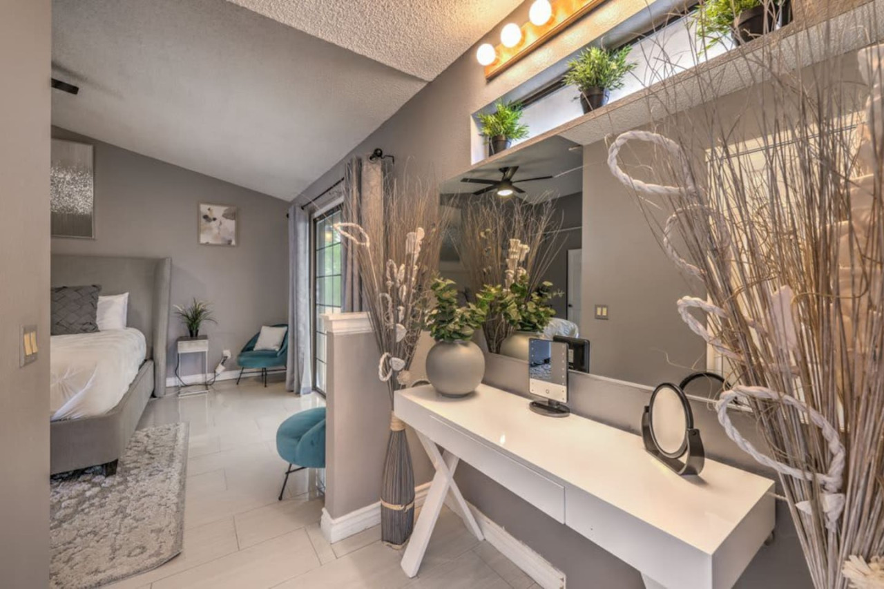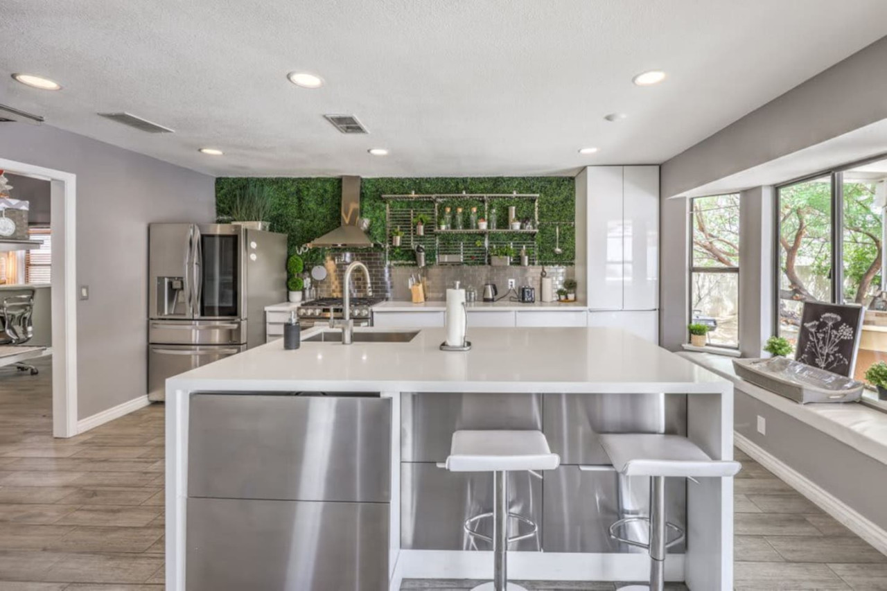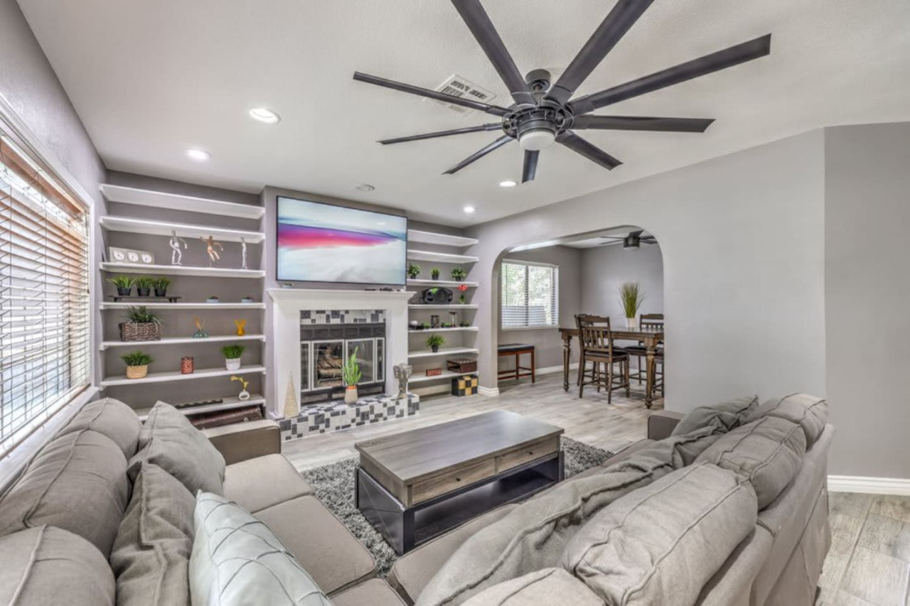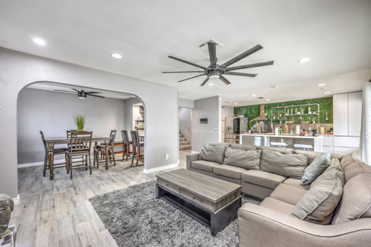 / night☞ 2,295 square feet | 213.21 sq meters ☞ 3 private bedrooms ☞ 2.5 bathrooms ☞ 4 Individual Beds ☞ Only 10 minutes to the Strip/Airport ☞ 2 - car private garage ☞ RV parking! ☞ Sparkling, modern PebbleTec pool and spa. Welcome to your luxurious private retreat in the heart of Las Vegas, where you can enjoy a peaceful and relaxing stay while still being just minutes away from the excitement and entertainment that the city is known for. Our stunning modern home, available for stays of 30 days or more, has been compl As you step inside this beautifully designed home, you'll be greeted by an open-concept living area with stylish furnishings, contemporary décor, and abundant natural light. The spacious living room features comfortable seating, perfect for unwinding after a day of exploring the city, and a large flat-screen TV for your entertainment needs. The fully equipped gourmet kitchen boasts state-of-the-art appliances, sleek countertops, and all the essentials you need to prepare delicious meals during your stay. Enjoy your culinary creations at the elegant dining table, which comfortably seats up to six guests. Our home offers three generously sized bedrooms, each featuring plush beds and high-quality linens to ensure a restful night's sleep. The primary bedroom includes a private en-suite bathroom with a walk-in shower and a soaking tub for ultimate relaxation. Outside, you'll find your own personal oasis with a sparkling PebbleTec pool and spa, surrounded by lush landscaping and ample lounge seating. This outdoor space is perfect for soaking up the sun, taking a refreshing dip, or enjoying a leisurely swim under the stars. In addition to the luxurious amenities within the home, you'll also have access to a two-car garage and dedicated RV parking, providing ample space for your vehicles during your stay. Our home's prime location means you're only a short drive away from Las Vegas' top attractions, including the famous Strip, Allegiant Stadium, and Reid International Airport. Whether you're visiting Las Vegas for business, pleasure, or an extended stay, our modern and sophisticated home offers the perfect blend of comfort, convenience, and luxury. Book your stay today and experience the best that the entertainment capital of the world has to offer, all while enjoying the peace and tranquility of your own private retreat! * We have security cameras facing the street and in the front door. * We have noise monitoring device in the backyard and in the living room. These devices only records the decibels to monitor noise level during quiet hours but NO audio recording. All of them are on 24/7 and for security purposes. There is no camera in private area or anywhere inside the house. Security cameras solely facing the street (as required by the City)