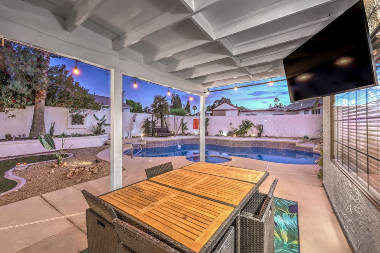 I booked this place for the backyard & just beware it looks nothing like the photos. Broken glass, trash left all over, no maintenance. The pool pump is broken so none of the debris filters just floats on top. The pool itself only runs for several hours a day, controlled by the company.. I also requested an early check in when i booked & i was told i had to wait to the day before. So i did & they strung me along all day until 3:50. Also they offered to TRY to have someone come out and clean the pool before the cleaning they had scheduled for Friday but told me i would have to pay for it LOL. I checked in on Wednesday. When the pool guy came Friday he informed us this pool wasn’t cleaned the day before we arrived like she said & hadn’t been cleaned in awhile because the last tenants were there for months & also she never contacted him Wednesday about cleaning before Friday. The inside of the house also doesn’t look like pics. I would highly NOT recommend this place or company altogether
