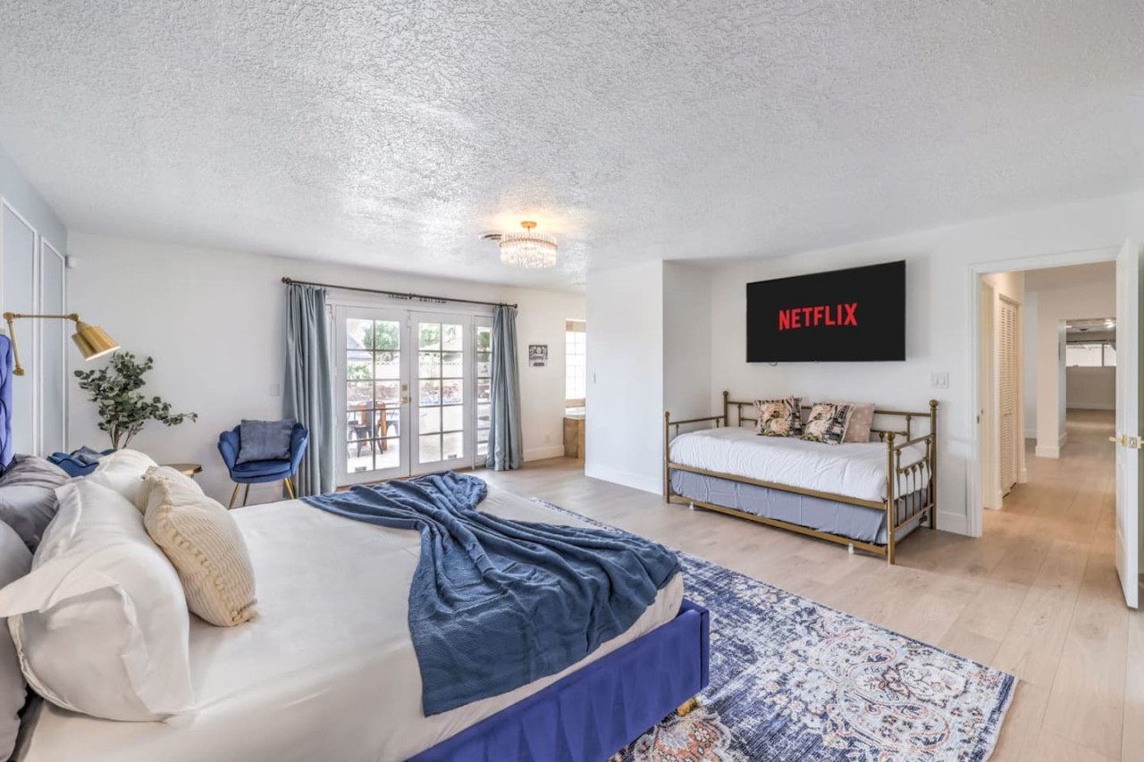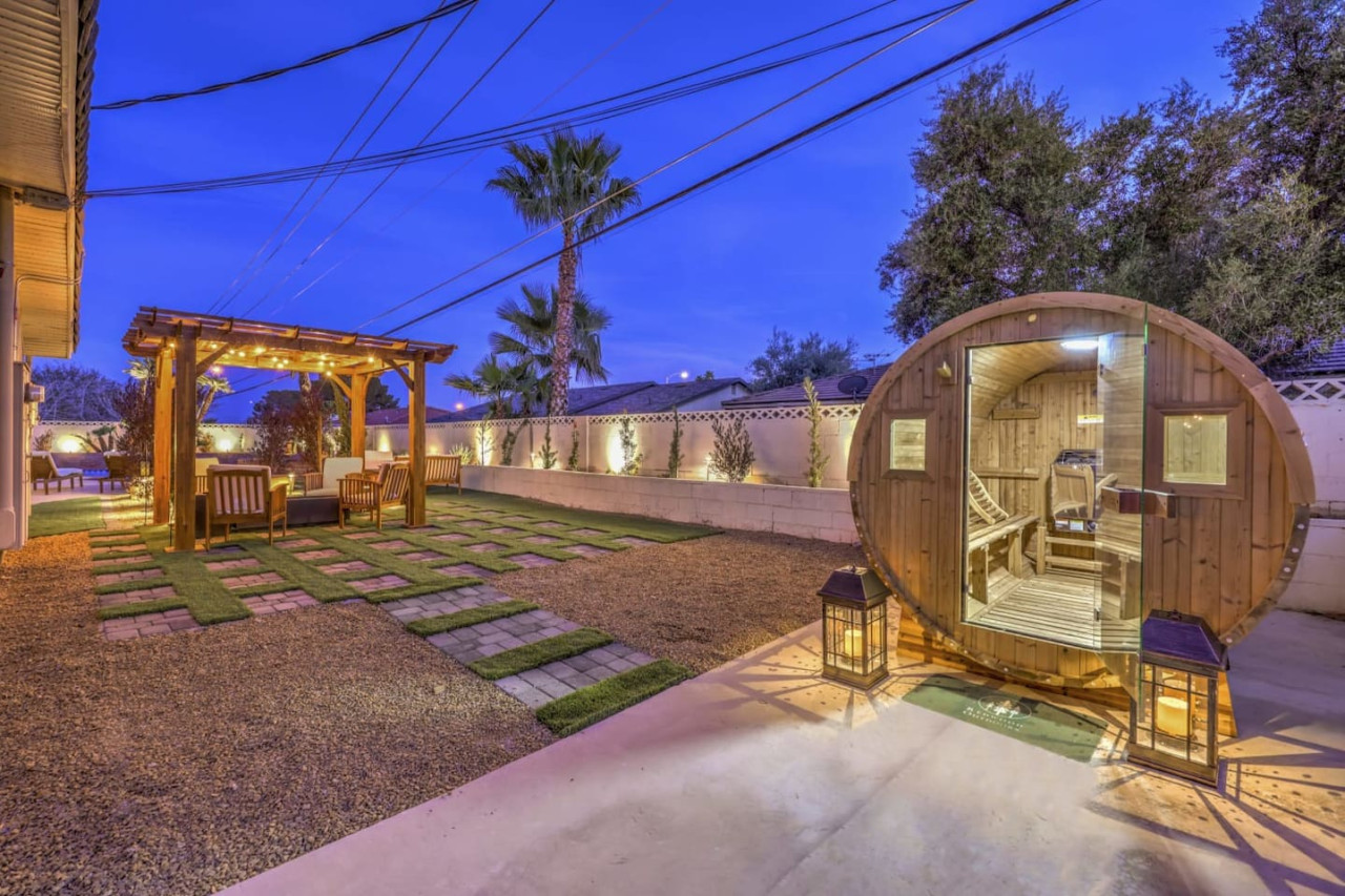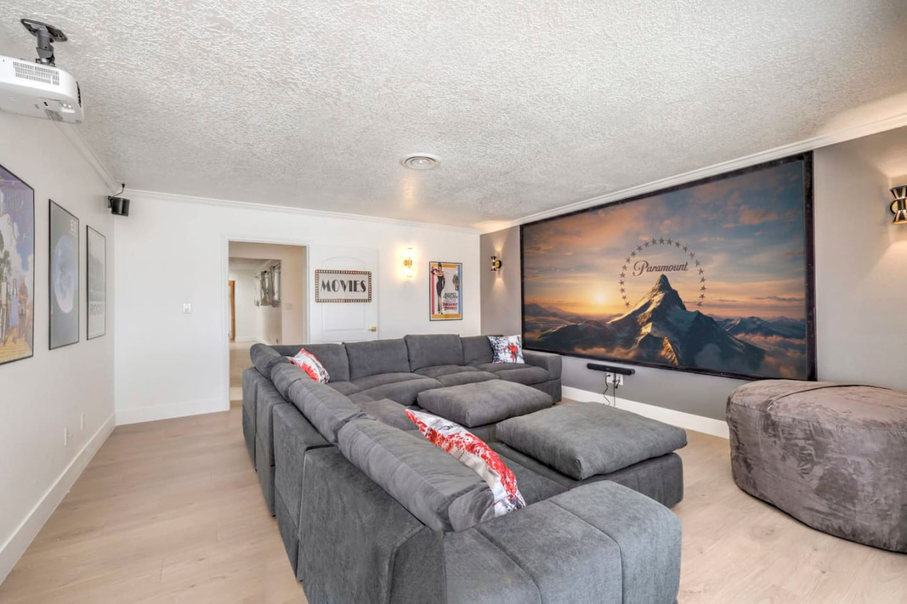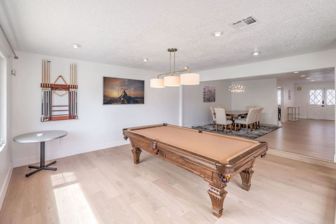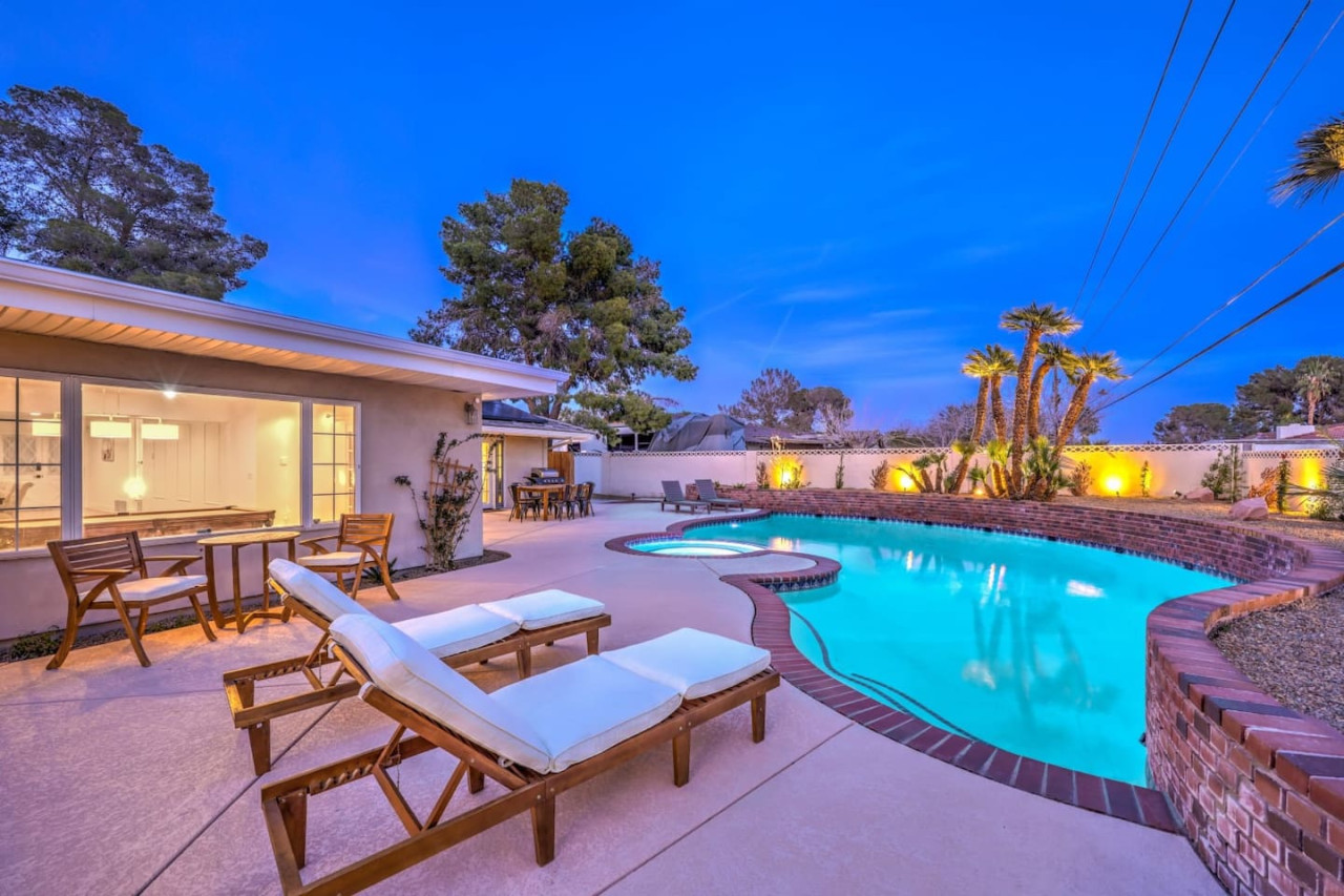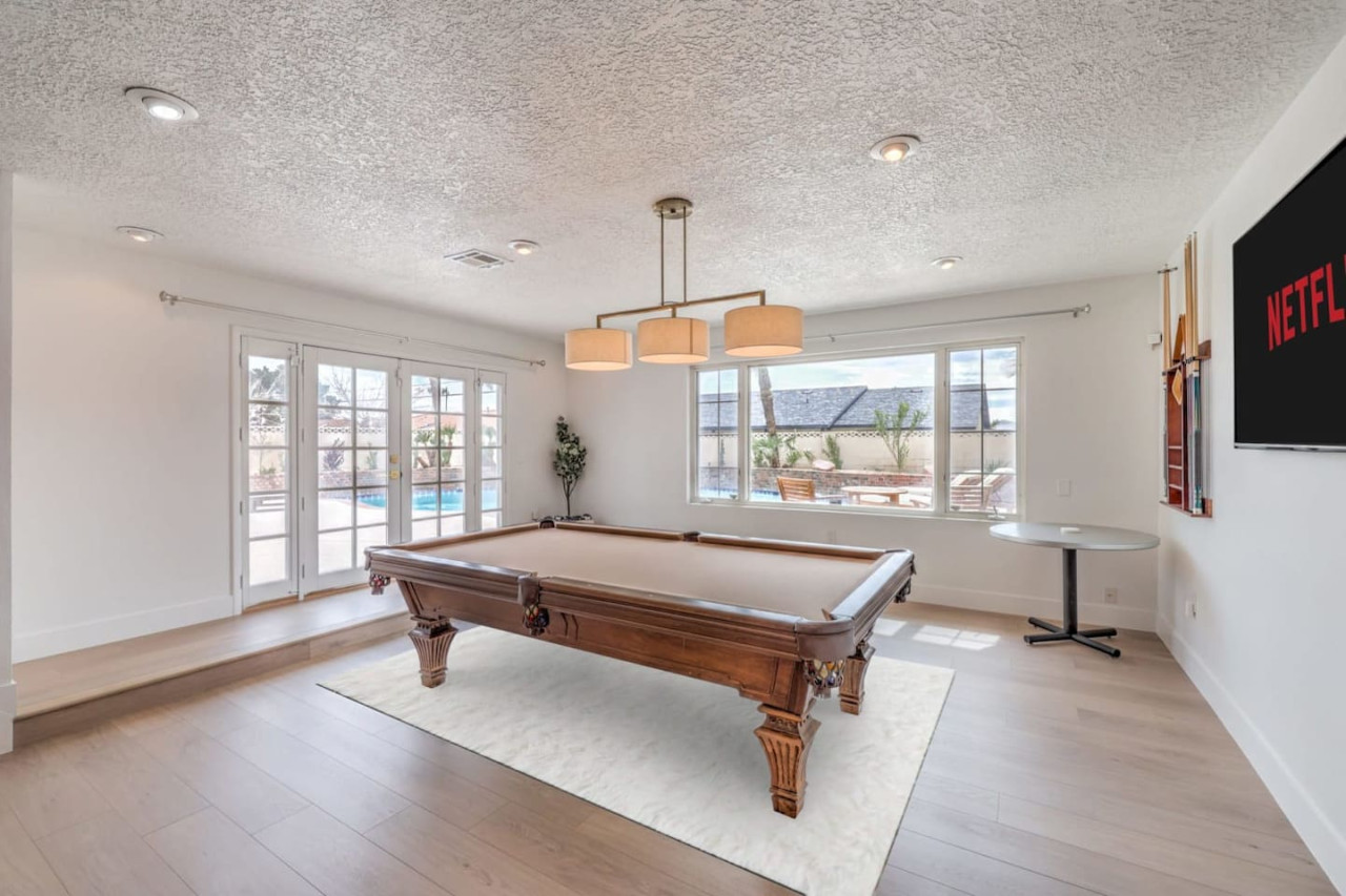 / night- Expansive 4,163 square ft villa - Less than 7 minutes to the Strip! - Grand Movie Theater with stock concession stand and arcade game! - Free access to HBO max, Disney+, Hulu, Netflix, ESPN+ - Sparkling pool and spa (Pool heating available for $100 per night) - 8 person sauna - Billiards Table - Ping pong table and corn hole set - Outdoor dining area and lounge chairs - BBQ grill - Pergola with conversation set to enjoy each others company - 5 bedrooms | 4 bathrooms (wow) Freshly renovated in 2023 by the owner, be among the first to enjoy this beautiful stay just minutes from the Strip. The home features incredible indoor and outdoor amenities with over 4100 square feet to enjoy. This is a massive one story home with 5 bedrooms, featuring 9 individual beds. The indoor has a fully stocked kitchen, huge living area, dining area, pool table area, movie theatre with arcade game, breakfast nook and more The backyard includes a BBQ, dining area, pergola with conversation set to relax in the shade, sun lounge chairs for relaxing in the sun, and of course the newly renovated heated pool, spa and hot sauna. The side patio is also lit up with a ping pong table and cornhole set to enjoy some games while relaxing Heated Pool (pool heating additional cost) - Complimentary Heated Spa (Wow) - 8 person sauna - Billiards Table - Outdoor dining area and lounge chairs - Pergola with conversation set to enjoy each others company - Outdoor patio game area with ping pong table and cornhole - Grand Movie theatre with stocked concession stand and arcade game - Fully Equipped Kitchen with Keurig and coffee grounds - 4100+ sq feet of spacious living area - 5 Bedrooms with Paris themed accents - 9 Individual Beds (1 king bed, 1 trundle with 2 twin beds, 1 queen bed, 4 full beds, 1 bunk bed with full bed and twin bed) - Wireless High-Speed Internet - 6 Smart TVs with Streaming - Pool heating available for $100 per night You have entire access to the home! The most exciting neighborhood in the world is just up the street! Also just 5 minutes to Reid International Airport About 5 minutes away from: ☞ Allegiant Stadium, home of the Raiders ☞ T-Mobile Arena, home of the Golden Knights ☞ Bellagio Conservatory ☞ Bellagio Gallery of Fine Art ☞ Fountains of Bellagio ☞ The Art of Richard MacDonald Presented by Cirque du Soleil ☞ CAESARS PALACE ☞ FORUM SHOPS ☞ Adventuredome at Circus Circus ☞ ARIA Campus Fine Art Collection ☞ The Gallery Featuring Dale Chihuly ☞ COSMOPOLITAN - The Ice Rink at Boulevard Pool Open Nov. 20 to Jan. 10 ☞ FLAMINGO - Wildlife Habitat at the Flamingo ☞ LINQ PROMENADE ☞ Brooklyn Bowl Bowling Lanes ☞ High Roller ☞ FlyLINQ ☞ Arcadia Earth ☞ Barbie: The Exhibition ☞ Big Bus Tours ☞ Fashion shows at Fashion Show mall ☞ FlyOver Las Vegas ☞ Hollywood Cars Museum ☞ Las Vegas Explorer Pass ☞ M&M's World ☞ Strip Gun Club ☞ The Range 702 ☞ Vegas Indoor Skydiving ☞ Welcome to Las Vegas sign Guests are required to sign a "Guest Rental Agreement" upon booking. * We have security cameras facing the street and in the front door. * We have noise monitoring device in the backyard and in the living room. These devices only records the decibels to monitor noise level during quiet hours but NO audio recording. * Most gas fireplaces are for decorative purposes only. * The fridge is not connected to a waterline due to leak risks. If you need an ice tray, we'll have one delivered within 24 hours. All of them are on 24/7 and for security purposes. There is no camera in private area or anywhere inside the house. Security cameras solely facing the street (as required by the City)
