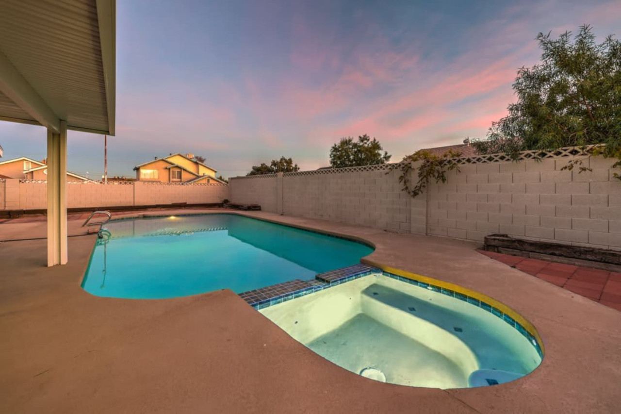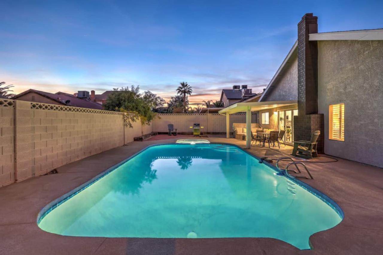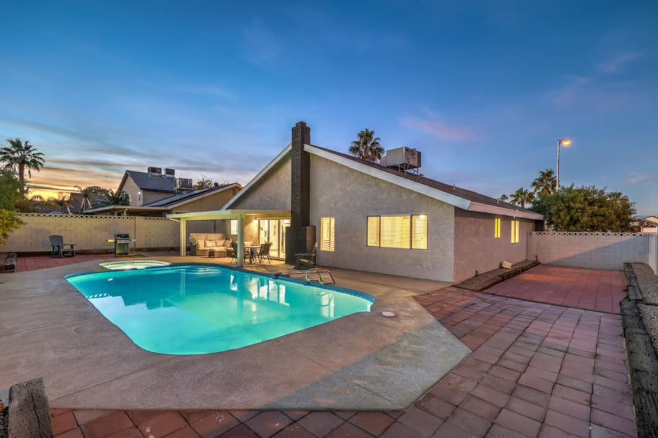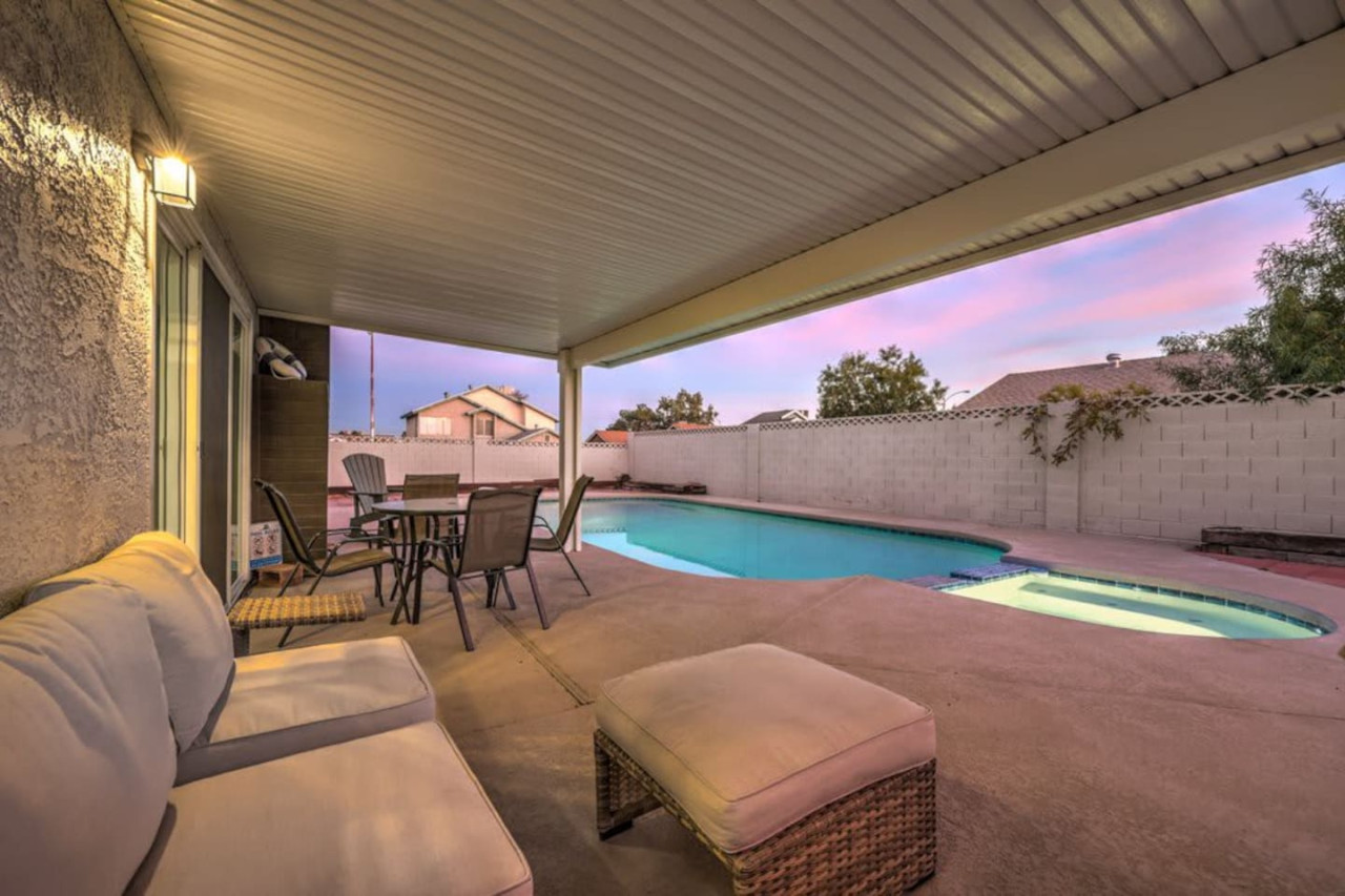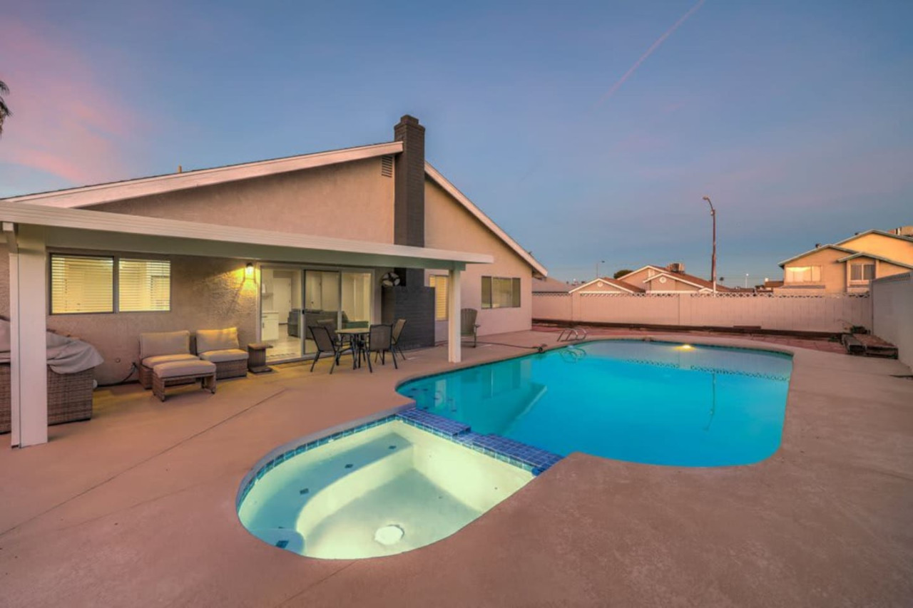 / night❍ 1,509 sqft | 140 sq meters ❍ 3 bedrooms, 2 bathrooms ❍ Sparkling pool and a heated spa ❍ Located in a convenient neighborhood, close-by shopping centers with a variety of stores and restaurants, and more ❍ Close to the Action** A mere 10 minutes away from the vibrant Strip! Welcome to your perfect home-away-from-home! This beautifully designed home offers an ideal blend of comfort, style, and convenience. A fully furnished property available for month-to-month extended stays, offering the ultimate in flexibility and convenience. Modern Kitchen with beautiful quartz, including small appliances. The house features a spacious backyard with a sparkling pool and a heated spa for day & night entertainment. The space ❁ Rules: 1) No Smoking Indoors 2) Pets Must Have Written Approval + Subject to Additional Deposit ╰┈➤ Long term stays (more than 90 days) requires lease ╰┈➤ Application, Lease and Security Deposit. Ask us for details ╰┈➤ Fully refundable security deposit: $3,600 ╰┈➤ Power, water and gas paid by tenant. Owner pays for internet, pool cleaning, and trash. ╰┈➤ Stays under 90 - maximum 5 hours per day Hot Tub usage - Surcharge applied if gas bill exceeds $200 for remaining balance. ╰┈➤ Ask about saving options for tenants Other things to note * We have security cameras facing the street and in the front door. * We have noise monitoring device in the backyard and in the living room. These devices only records the decibels to monitor noise level during quiet hours but NO audio recording. *The fridge is not connected to a waterline due to leak risks. If you need an ice tray, we'll have one delivered within 24 hours. All of them are on 24/7 and for security purposes. There is no camera in private area or anywhere inside the house. Security cameras solely facing the street (as required by the City) * We have security cameras facing the street and in the front door. * We have noise monitoring device in the backyard and in the living room. These devices only records the decibels to monitor noise level during quiet hours but NO audio recording. *The fridge is not connected to a waterline due to leak risks. If you need an ice tray, we'll have one delivered within 24 hours. *The mailbox access or keys are not provided unless the guest has a lease agreement. All of them are on 24/7 and for security purposes. There is no camera in private area or anywhere inside the house. Security cameras solely facing the street (as required by the City)