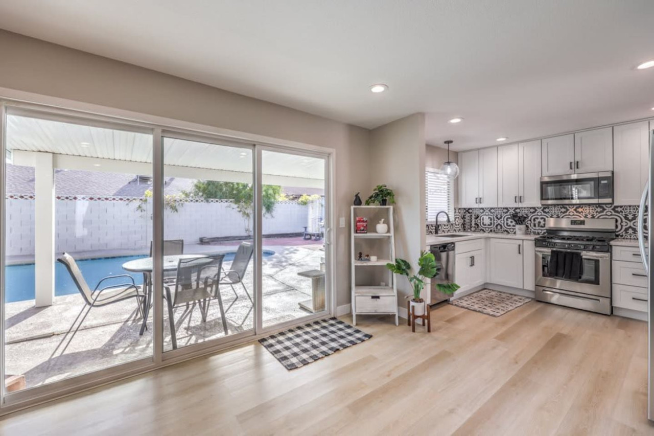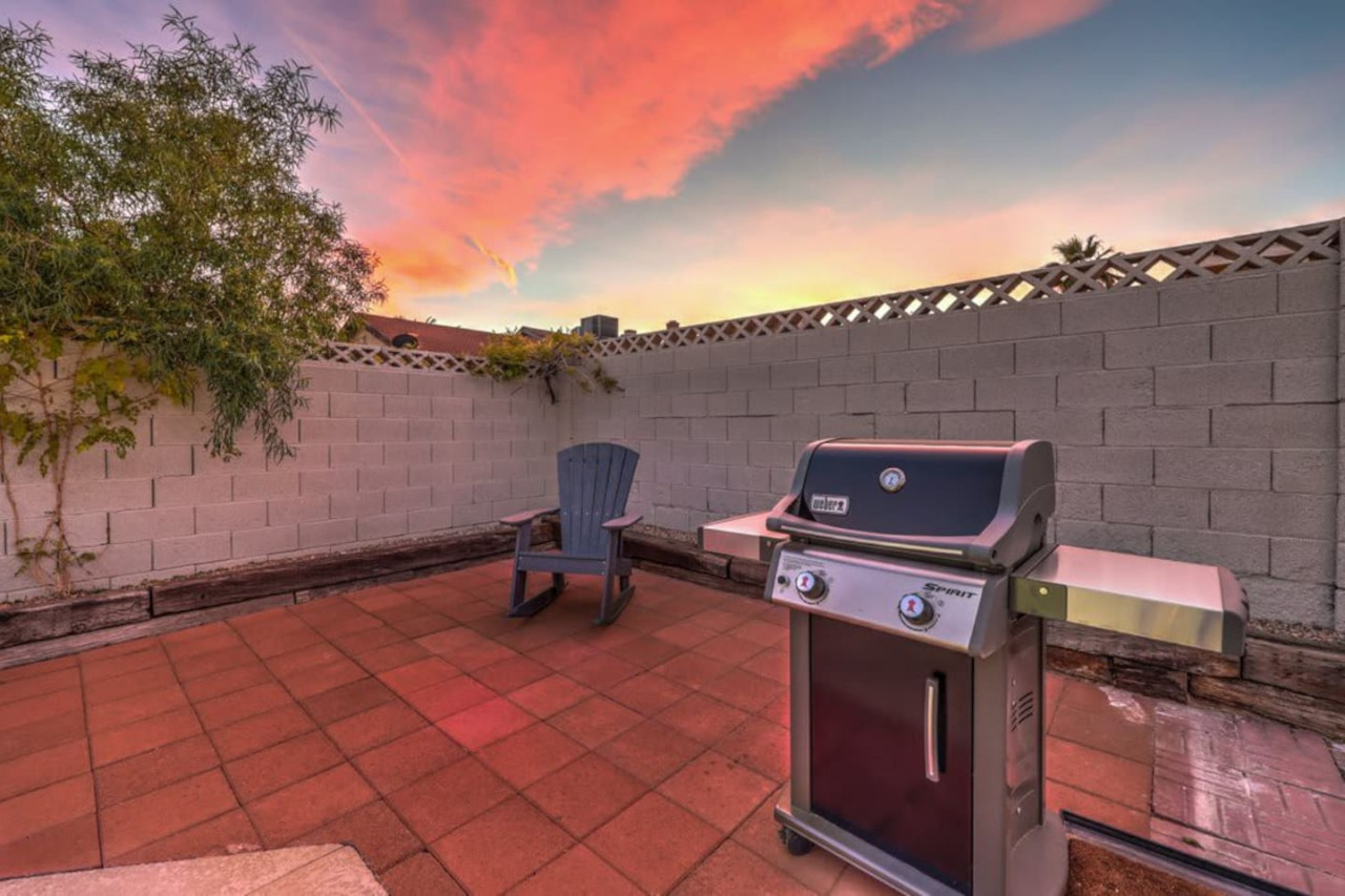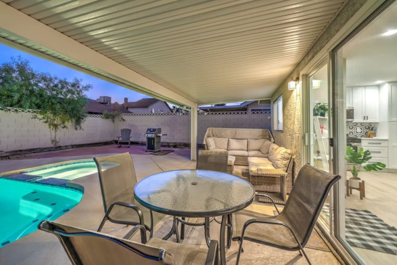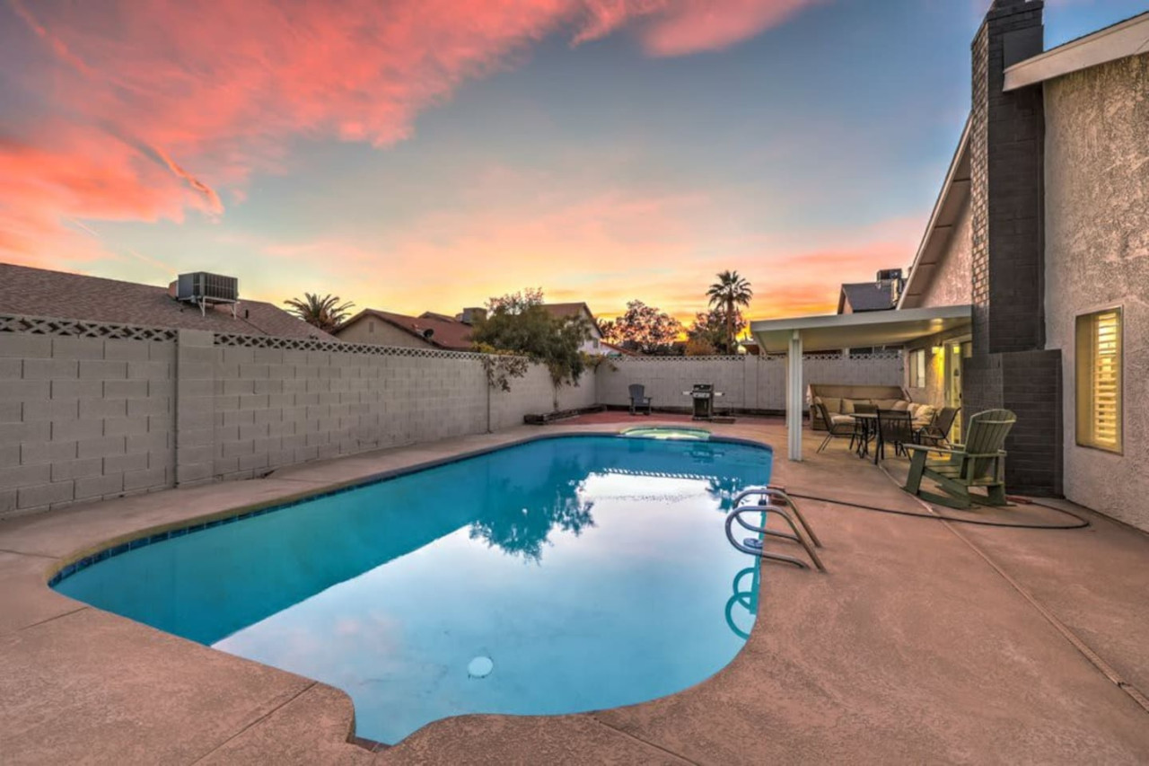 / night❍ 1,509 sqft | 140 sq meters ❍ 3 bedrooms, 2 bathrooms ❍ Sparkling pool and a heated spa ❍ Located in a convenient neighborhood, close-by shopping centers with a variety of stores and restaurants, and more ❍ Close to the Action** A mere 10 minutes away from the vibrant Strip! Welcome to your perfect home-away-from-home! This beautifully designed home offers an ideal blend of comfort, style, and convenience. A fully furnished property available for month-to-month extended stays, offering the ultimate in flexibility and convenience. Modern Kitchen with beautiful quartz, including small appliances. The house features a spacious backyard with a sparkling pool and a heated spa for day & night entertainment. The space ❁ Rules: 1) No Smoking Indoors 2) Pets Must Have Written Approval + Subject to Additional Deposit ╰┈➤ Long term stays (more than 90 days) requires lease ╰┈➤ Application, Lease and Security Deposit. Ask us for details ╰┈➤ Fully refundable security deposit: $3,600 ╰┈➤ Power, water and gas paid by tenant. Owner pays for internet, pool cleaning, and trash. ╰┈➤ Stays under 90 - maximum 5 hours per day Hot Tub usage - Surcharge applied if gas bill exceeds $200 for remaining balance. ╰┈➤ Ask about saving options for tenants Other things to note * We have security cameras facing the street and in the front door. * We have noise monitoring device in the backyard and in the living room. These devices only records the decibels to monitor noise level during quiet hours but NO audio recording. *The fridge is not connected to a waterline due to leak risks. If you need an ice tray, we'll have one delivered within 24 hours. All of them are on 24/7 and for security purposes. There is no camera in private area or anywhere inside the house. Security cameras solely facing the street (as required by the City) * We have security cameras facing the street and in the front door. * We have noise monitoring device in the backyard and in the living room. These devices only records the decibels to monitor noise level during quiet hours but NO audio recording. *The fridge is not connected to a waterline due to leak risks. If you need an ice tray, we'll have one delivered within 24 hours. *The mailbox access or keys are not provided unless the guest has a lease agreement. All of them are on 24/7 and for security purposes. There is no camera in private area or anywhere inside the house. Security cameras solely facing the street (as required by the City)